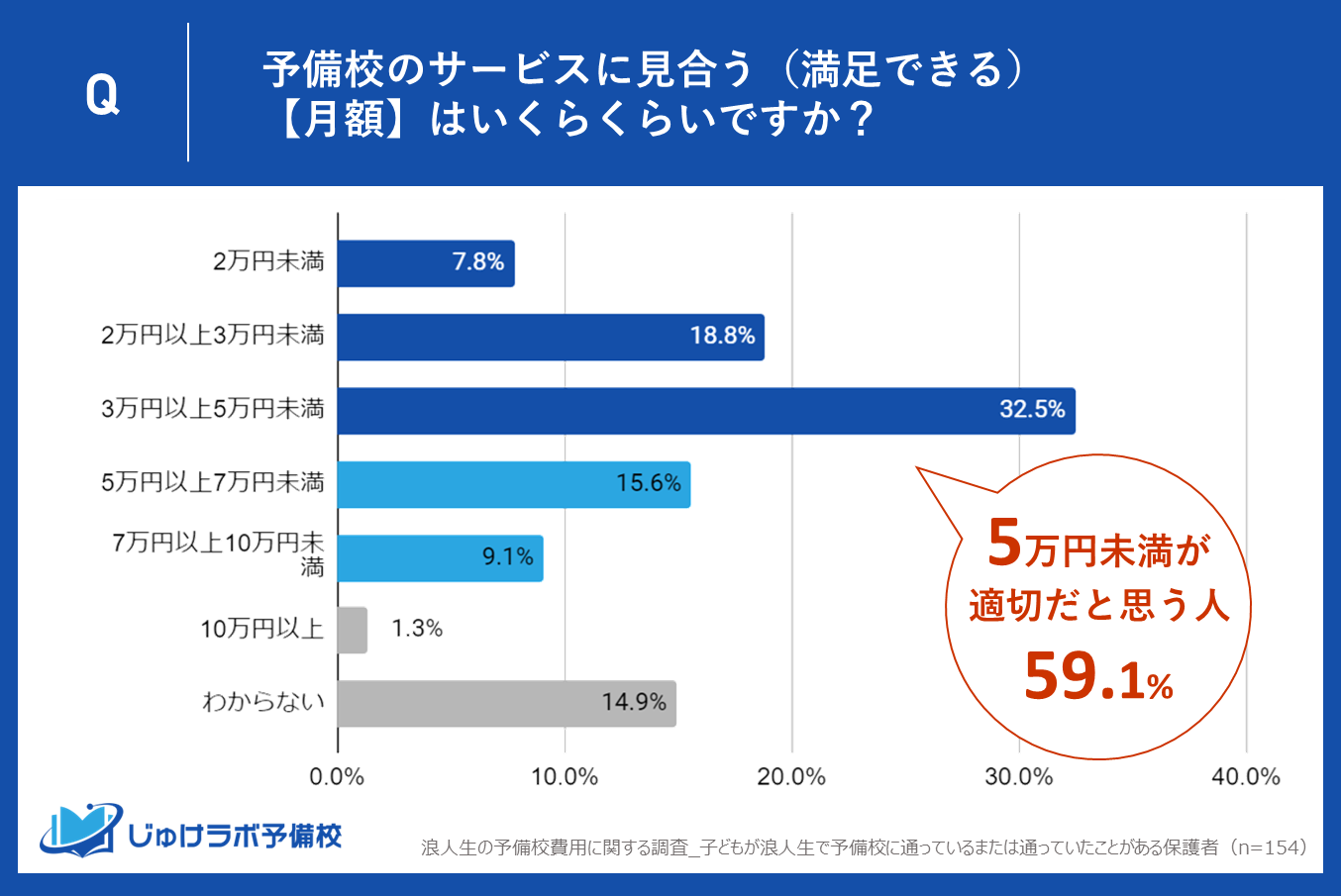 アンケート結果より、32.5%(50人)の保護者が「3万円以上5万円未満」を予備校や塾のサービスに対する適切な月額費用と考えていることが判明しました。実際に支出している月額の教育費調査でもこの価格帯は多くの保護者が実際に支出している範囲として3番目にランキングされています。しかしQ1で「5万円以上10万円未満」が実際の予備校費・塾代の支出価格帯としてもっとも多いボリュームゾーン(31.4%)である事を踏まえると、今より安い金額を適切な費用と感じている浪人生の保護者が多いと思われます。5万円未満を適切な価格だと感じる方は合計で59.1%という結果になりました。