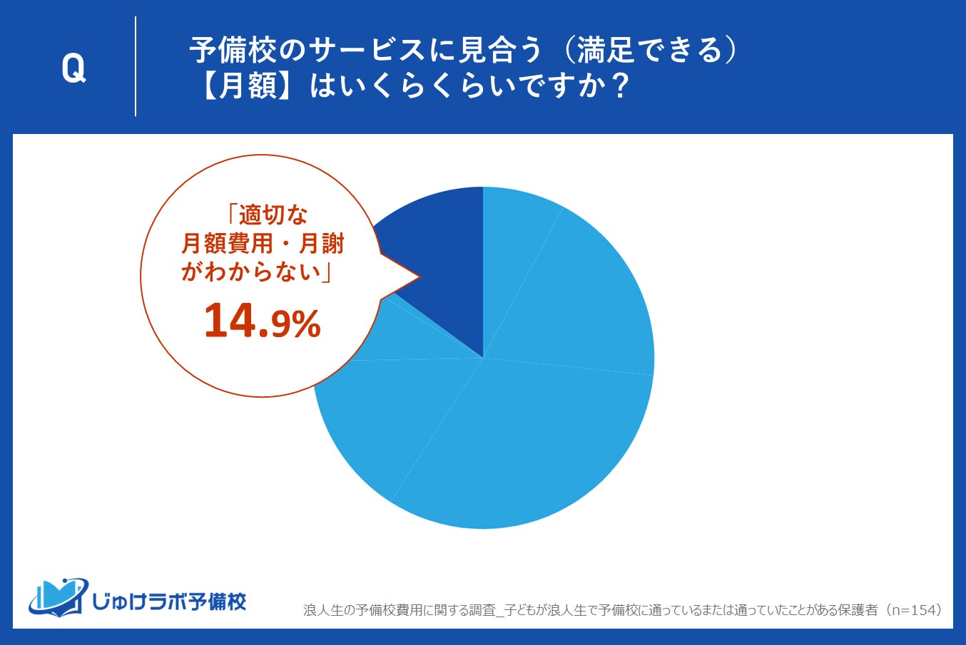 一方で、「適切な月額費用がわからない」と回答した保護者が14.9%(23人)となっています。これは、予備校や塾のサービス内容や、他との比較、さらには子供の進学先や学力に応じた適切な費用が不明確であることを示唆している可能性があります。予備校や塾には、サービス内容と費用のバランスを明確に伝える情報提供が求められていることがこのデータよりわかります。