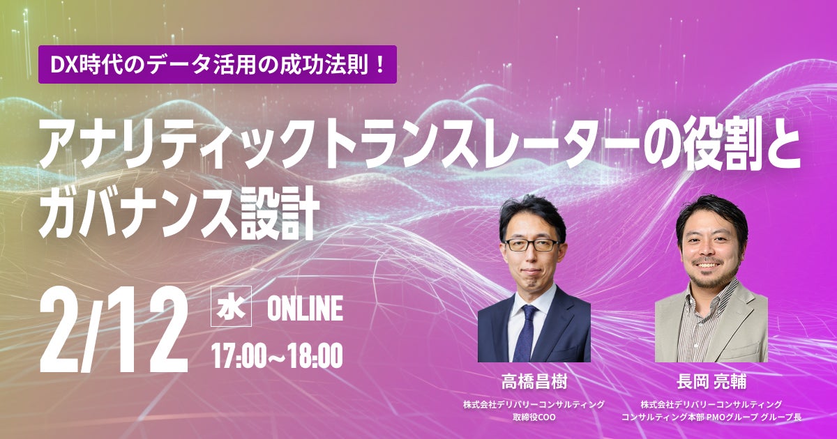 データリテラシーの向上を通じてデータドリブンカンパニーへの変革を支援する株式会社デリバリーコンサルティング(本社:東京都港区、取締役CEO:内藤 秀治郎)は、データドリブンな組織を実現するためのデータガバナンス設計とアナリティックトランスレーターが担うべき役割をテーマとしたWEBセミナーを開催いたします。