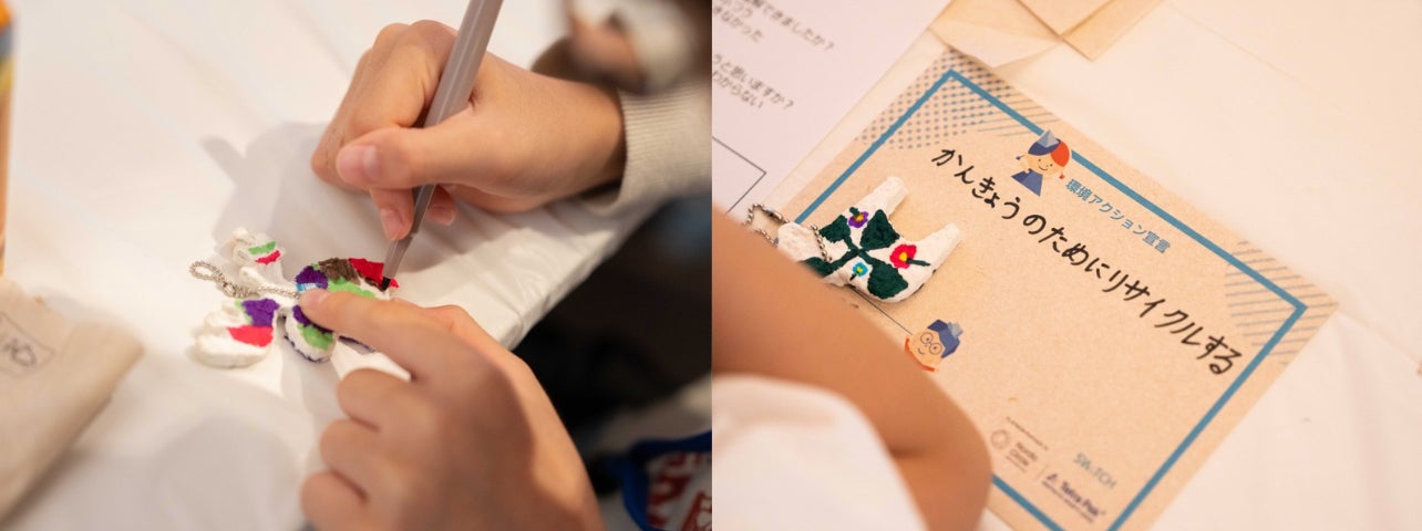佐座氏の指導のもと、子どもたちは使用済み紙パックから紙繊維を取り出し、スウェーデンにゆかりのある動物の形をしたキーチェーンを制作。紙パックが新しいアイテムに生まれ変わる工程を体験し、リサイクルの楽しさやモノを大切にする心を育みました。