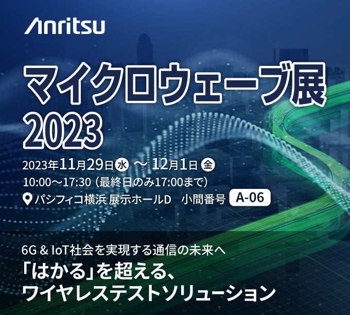 アンリツブースでは、4つのテーマ(「Beyond 5G/6G」、「オートモーティブ・IoT」、「干渉波探索・電波監視」、「次世代技術の研究」)で、6G & IoT社会の実現に貢献するテストソリューションをご紹介します。