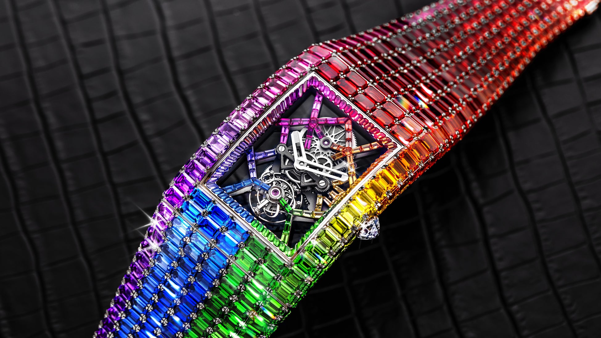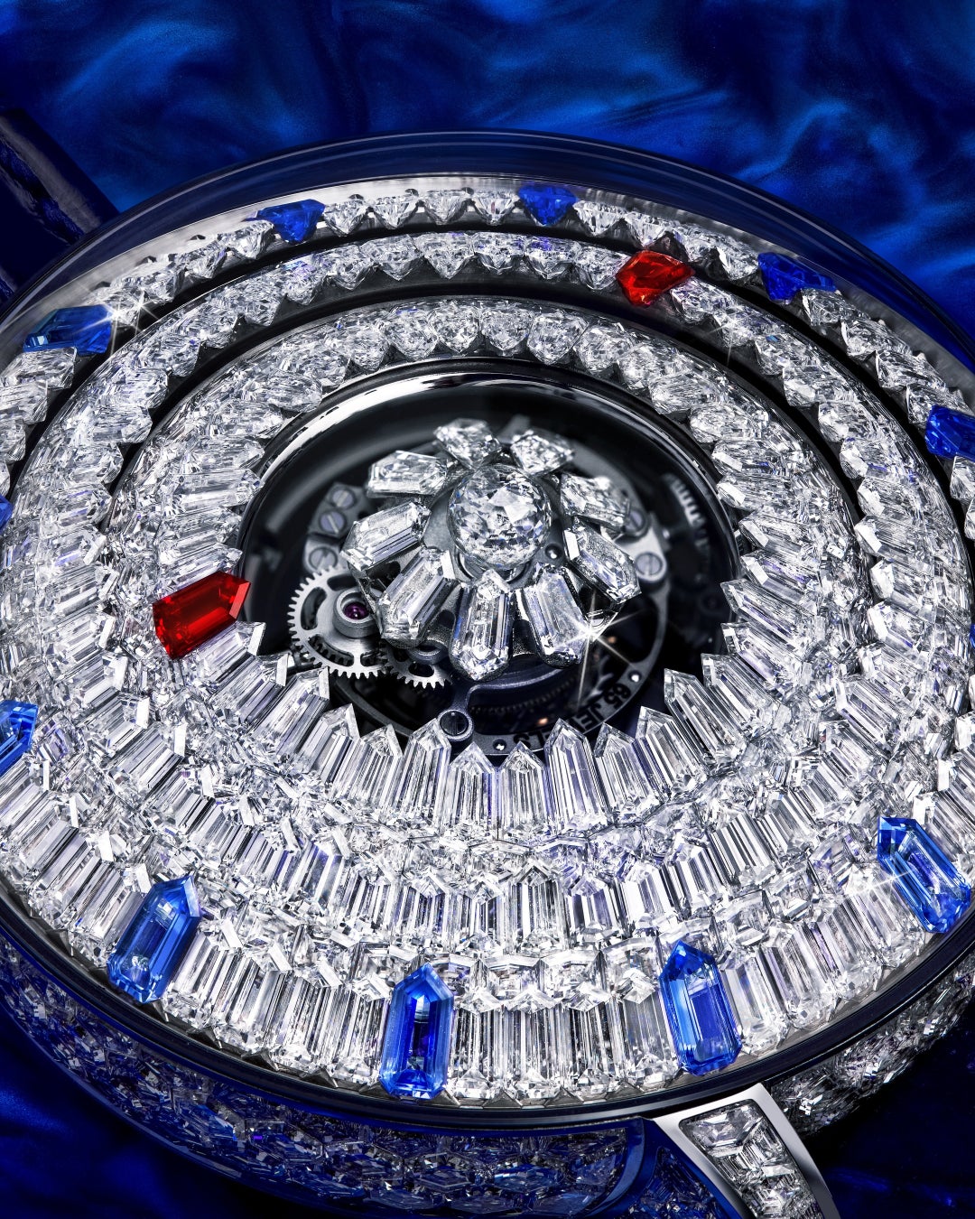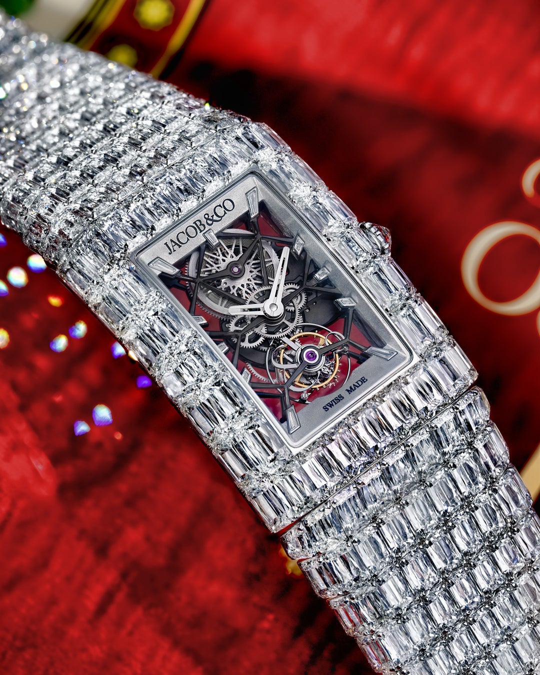 特筆すべきは、18Kゴールド製の繊細なブリッジ構造です。本来、これほど膨大な宝石を隙間なくセッティングした重厚なケースは、ムーブメントに凄まじい物理的圧力をかけます。しかし、ジェイコブ&コーは極限の肉抜きを施しながらも、構造的な安定性を完璧に維持する空間設計を実現しました。