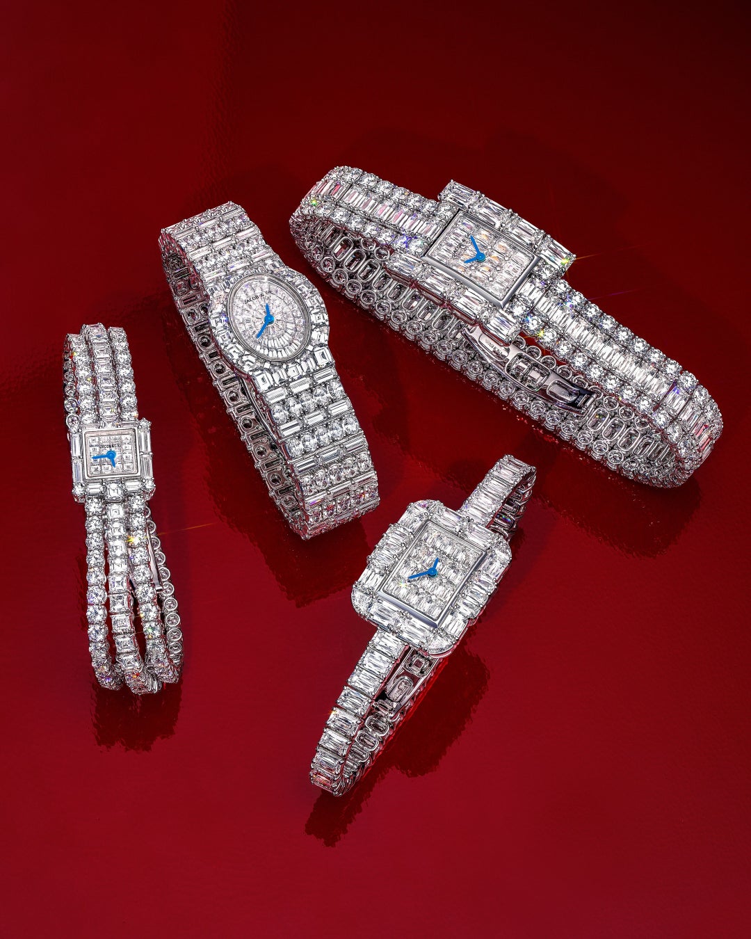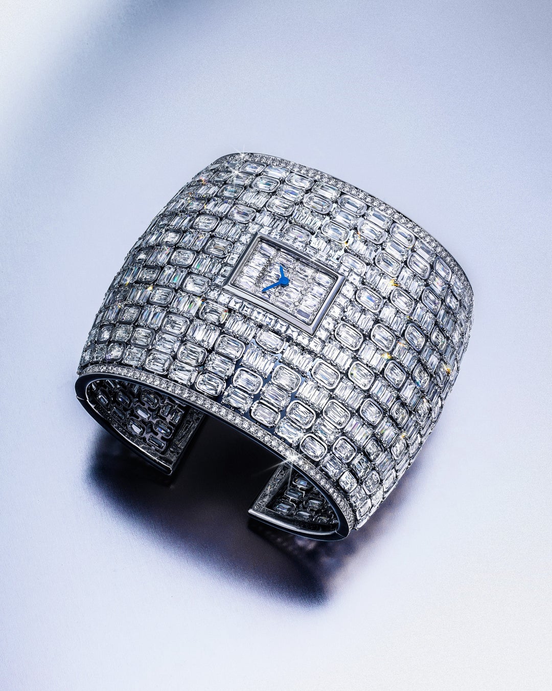 ホワイトゴールドのバングル全体に、合計424石・112.2ctものダイヤモンドを贅沢にセット。そのすべてに、時計ブランドとして唯一ジェイコブ&コーのみが使用を許されたアショカカットが施されています。さらには文字盤にもアショカカットとスクエアカットダイヤモンドを配し、時計という枠を超えた存在に仕上がっています。