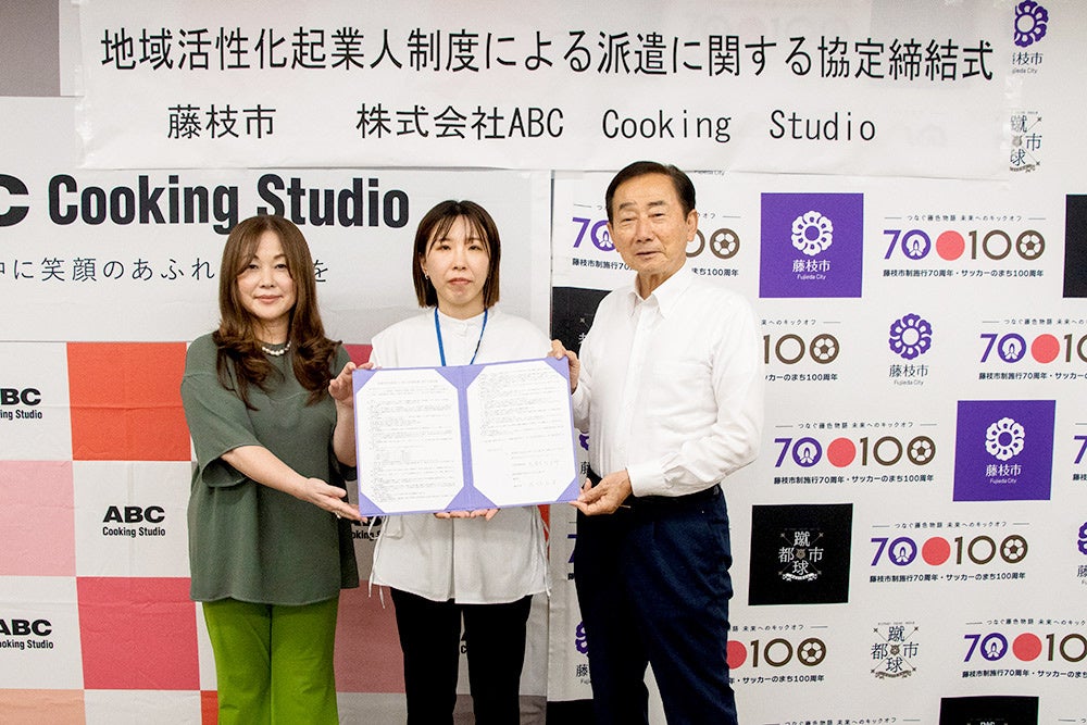 2024年8月5日に藤枝市とABCクッキングスタジオの地域活性化起業人派遣に関する協定の締結式を執行いたしました。当日は、藤枝市長北村正平および、株式会社ABC Cooking Studio代表取締役社長 兼 CEO 志村なるみが出席し、地域活性化起業人派遣に関する協定を締結しました。