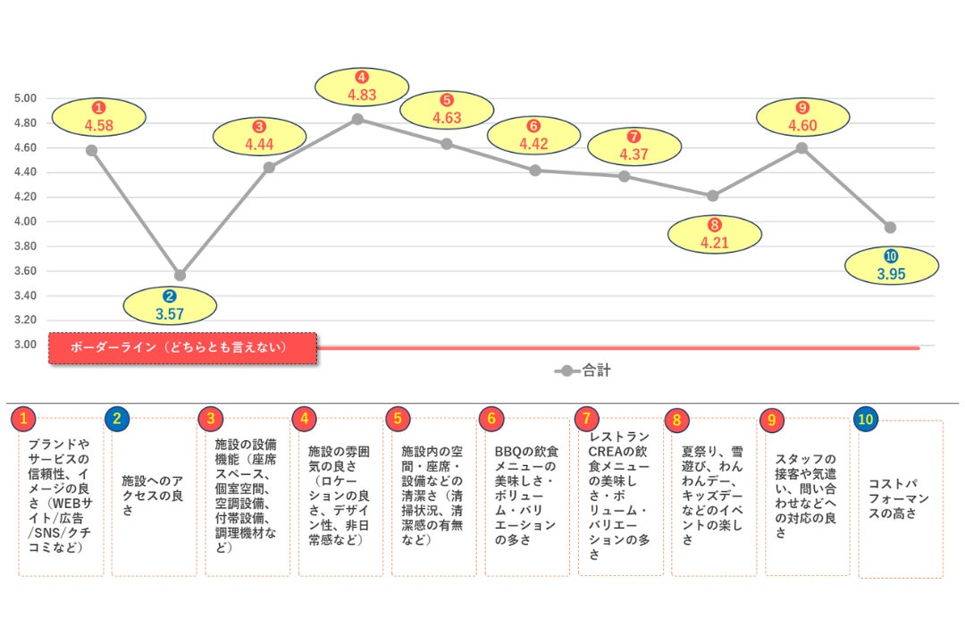 一方で、「施設へのアクセス」「コストパフォーマンス」は今後の課題としてとらえるべき評価となりました。都内では唯一無二な圧倒的なリゾート感を感じられる施設としてのプレミアム性を磨き続けることはもちろん、お子さま連れやわんちゃん連れなど様々な利用シーンに対応するBBQのメニューのバリエーション強化を課題として捉え、今後の改善に向けた具体的な取り組みにつなげてまいります。