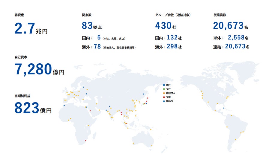 双日グループは現在、日本国内外約430社の子会社・関連会社で構成され、約20,700人の従業員が世界約50か国・地域で活動しています。