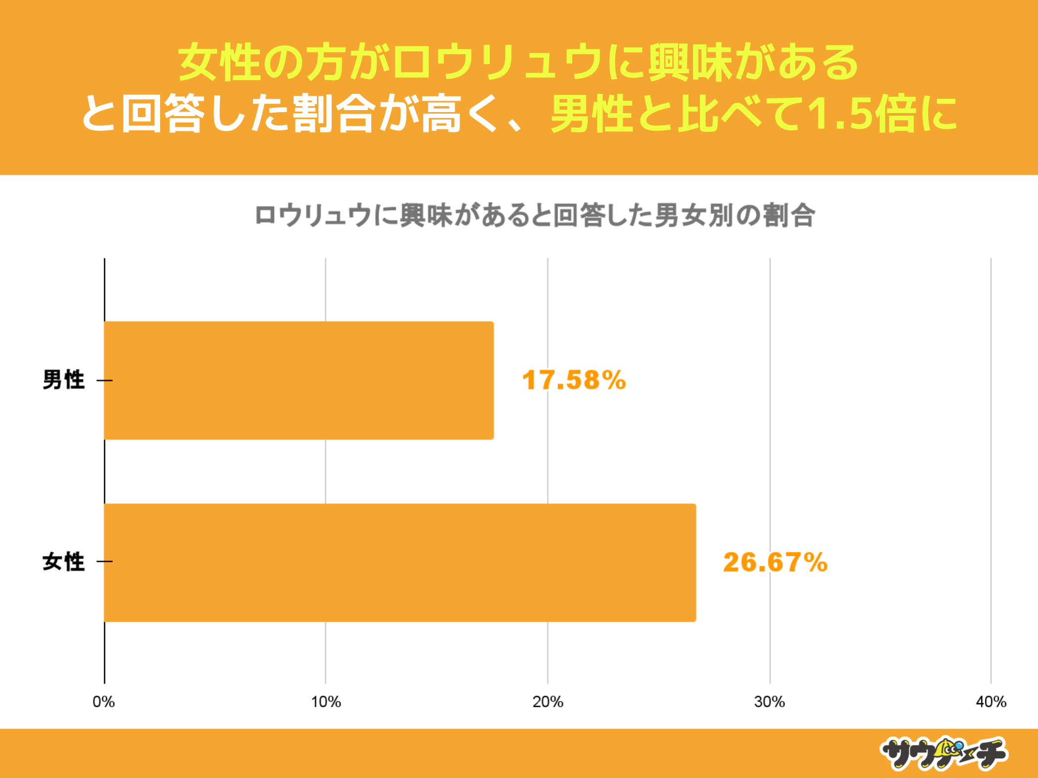 ロウリュウに興味があると回答した割合を男女別でみてみますと、女性が26.67%、男性が17.58%で、男性と比べて女性は1.5倍高い結果となりました。