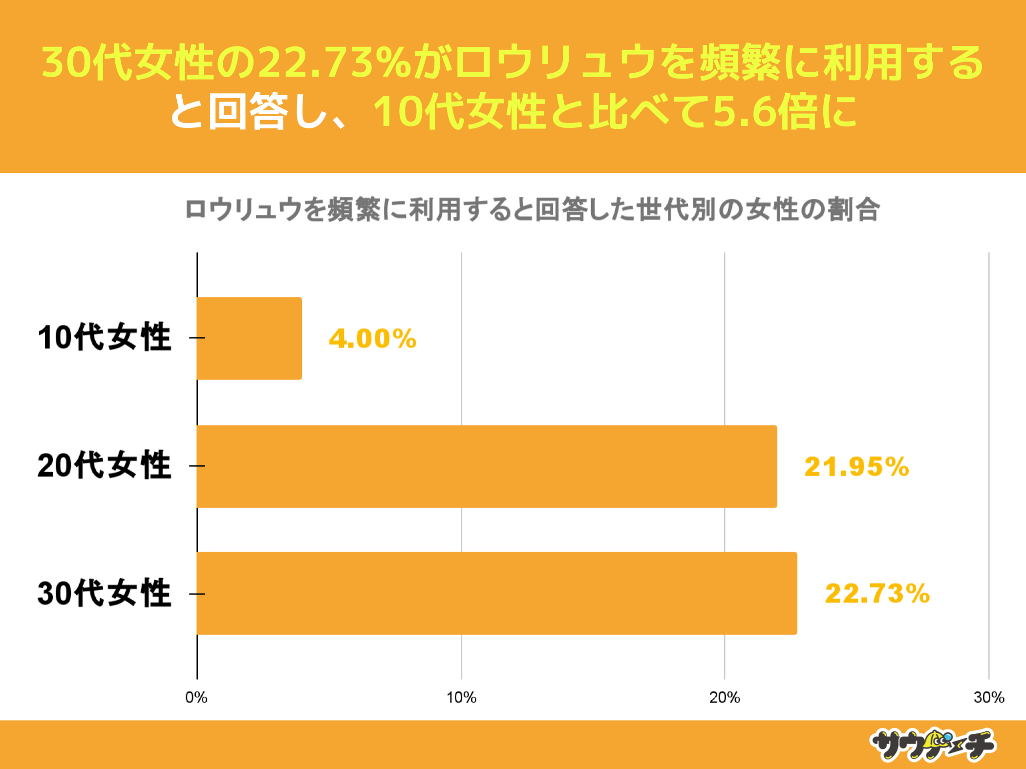 ロウリュウを頻繁に利用すると回答した割合を世代別の女性でみてみますと、30代女性の22.73%が最も高く、次いで20代女性の21.95%、10代女性が4%で、10代女性と比べて30代女性は5.6倍高い結果となりました。