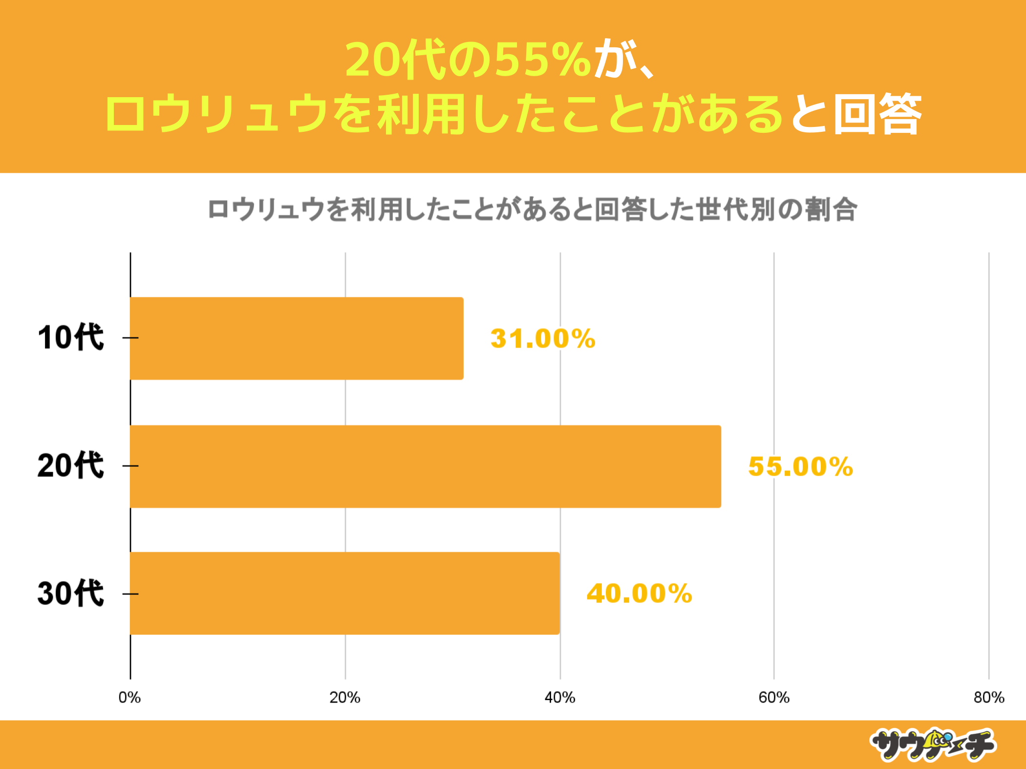 また、ロウリュウを利用したことがあると回答した割合を世代別でみてみますと、20代の55%が最も高く、次いで30代の40%、10代が31%で、20代の半数以上がロウリュウを利用したことがあるという結果になりました。