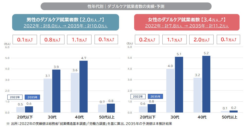 2022年と2035年のダブルケア就業者数を性年代別に見た。男女ともにすべての年代でダブルケア就業者は増える見込み。この要因には、晩婚化や晩産化、高齢化が考えられる。