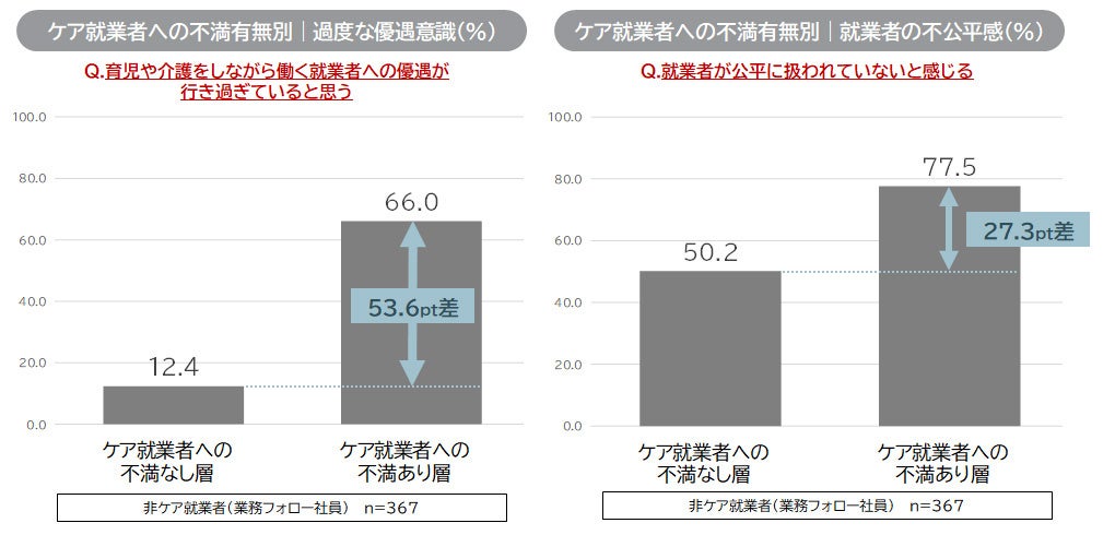 9. ケア就業者の業務をフォローする非ケア就業者の約7割が企業からの支援不足を感じ、そのような層ほどケア就業者に対して特別扱い感を強く抱いている傾向がある。