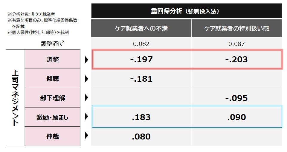 8. 上司による調整型のマネジメントは、非ケア就業者側の、ケア就業者に対する不満や特別扱い感を抑える傾向にある一方で、上司からの激励・励ましは、逆にこれらの意識を高める傾向がある。