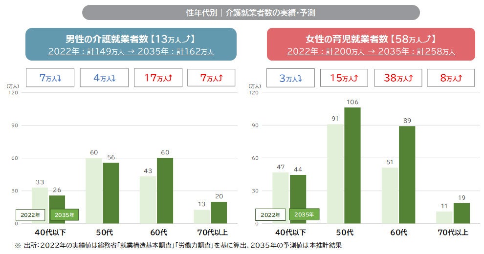 2022年と2035年の育児就業者数を性年代別に見ると、男女ともに40代以外のすべての年代で育児就業者は増える見込み。この背景には、男性は育児就業率の増加、女性は労働力率(労働参加率)の増加があると考えられる。