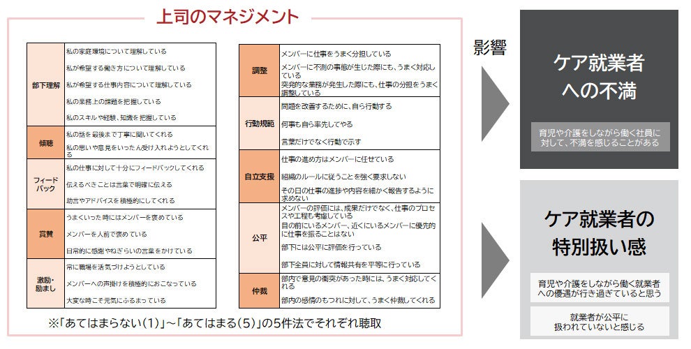 この背景には、周囲への仕事のしわ寄せを恐れるケア就業者の意識が潜む。本調査からは、周囲への業務の代替が、非ケア就業者側の不満を高めており、こうした不満の蓄積が、ケア就業者の制度利用の足かせとなっている可能性がうかがえている。今後は、非ケア就業者の意識により一層目を向け、調整型の上司マネジメントを行っていくことや、働き方制度における特別扱いを緩和していくことなどが重要だろう。