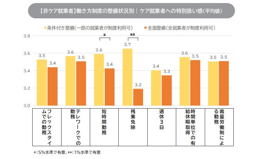 10. 柔軟な働き方制度は、一部の就業者だけが利用できる条件付き整備よりも、全従業員が利用可能な全面整備の方が、非ケア就業者の“特別扱い感”が低い傾向が見られる。