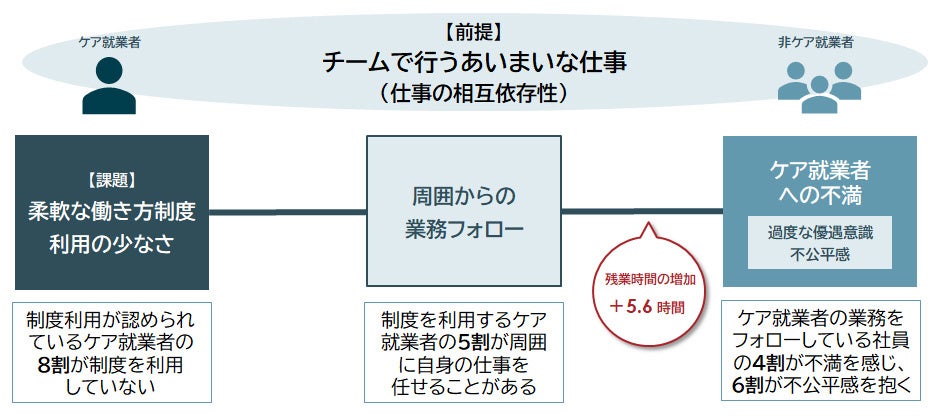 一方、柔軟な働き方制度が整備されても、実際の利用率は2割にとどまります。背景には、ケア就業者自身の“しわ寄せ懸念”や、非ケア就業者の不満・特別扱い感といった職場内の構造的課題があることが明らかになりました。