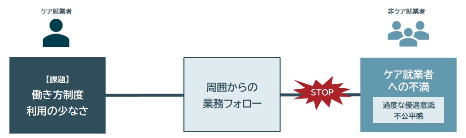 ケア就業者のいる職場の課題を解決するには、まずは非ケア就業者側の不満を抑制し、ケア就業者が働き方制度を利用しやすい風土を醸成していくことが重要と考えられる。
