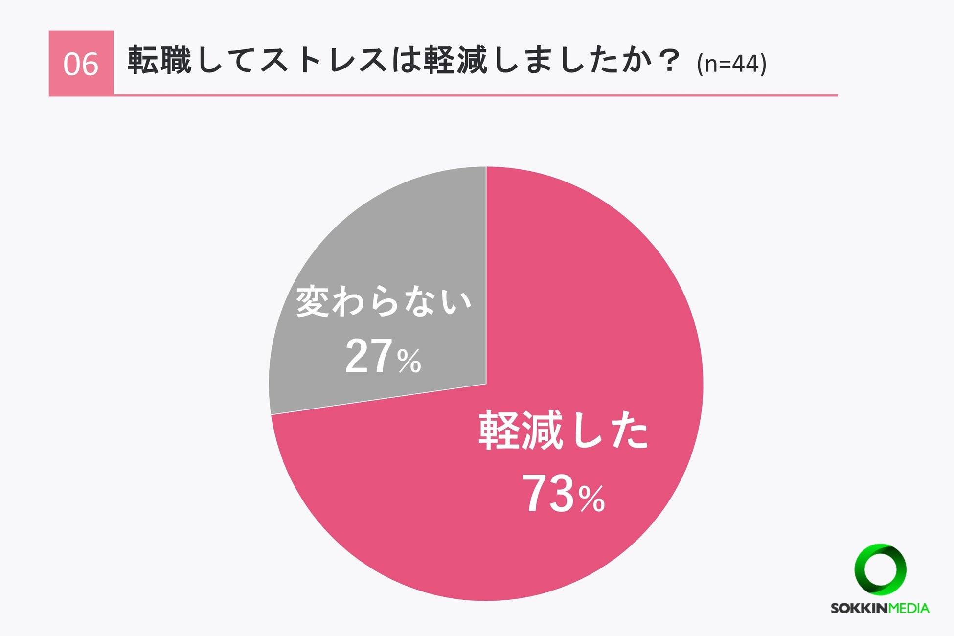 これまでにストレスが原因で転職をしたことがあると答えた方のみに行った「Q6.転職してストレスは軽減しましたか?」という問いに対して、「軽減した」と回答した方が最も多く73%という結果になりました。「変わらない」と回答した方は27%でした。