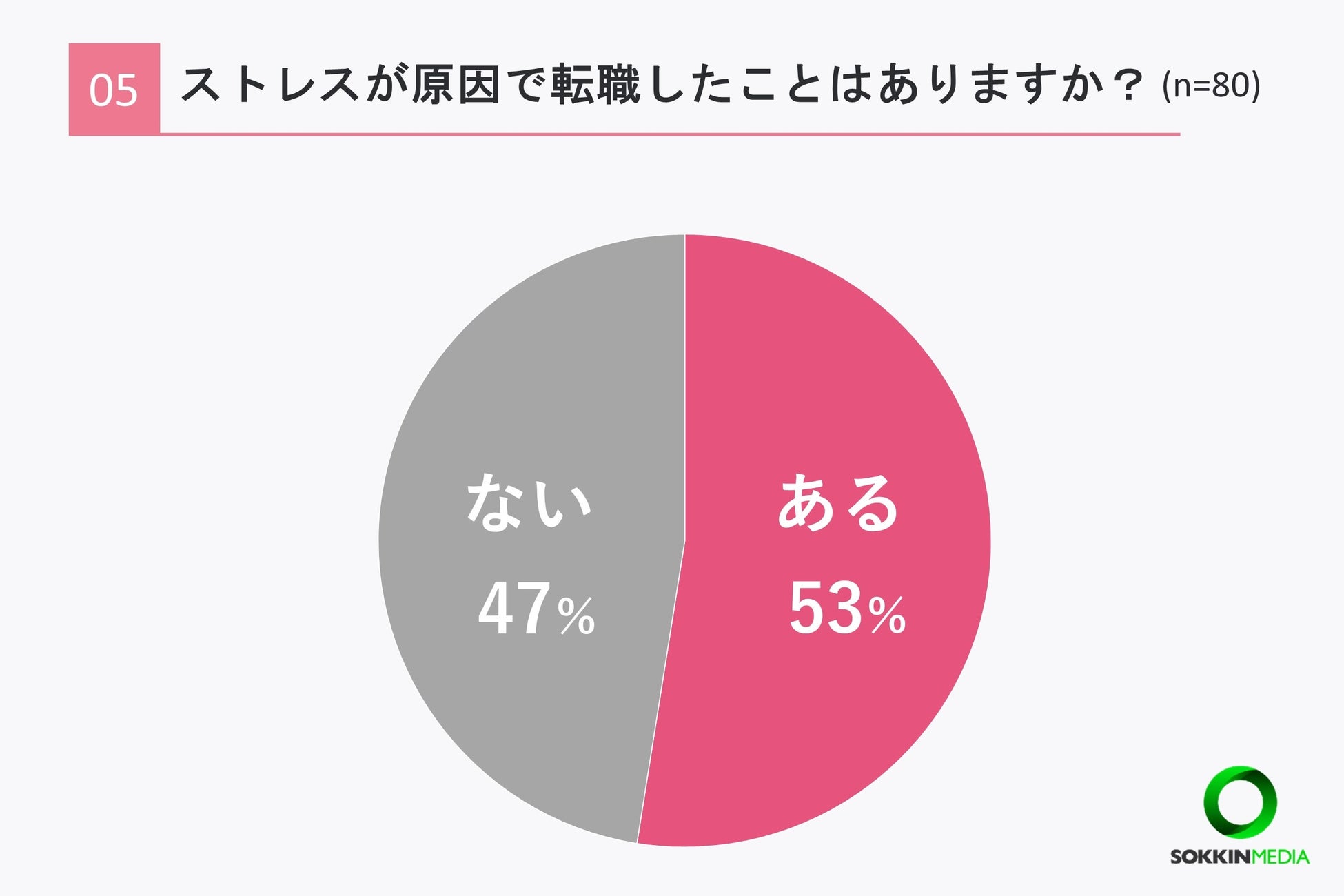 「Q5.ストレスが原因で転職したことはありますか?」という問いに対して、あると答えた方の方がやや多く53%、「ない」と回答した方は47%という結果になりました。
