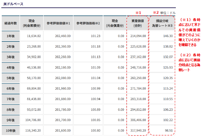 本日の「参考購入単価」で対象となる債券をご購入いただいた場合、1年後から10年後までの資産価値が米ドルベースでどのように変動するかを示しています。利金の累積価値や参考評価価格、償還時の現金などがどのように推移するかをご確認いただけます。合わせて、各時点において損益分岐点となる為替レートがどのように変化し、どの程度円ベースでの損益バッファが増減していくのかを確認できます。