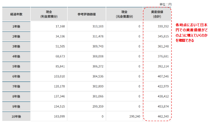 本日の「参考購入為替レート」をもとに、日本円での資産価値がどのように推移するのかを示しています。為替レートは購入時から変動しない前提の値ではありますが、日本円での評価額の推移を事前にご確認いただけます。