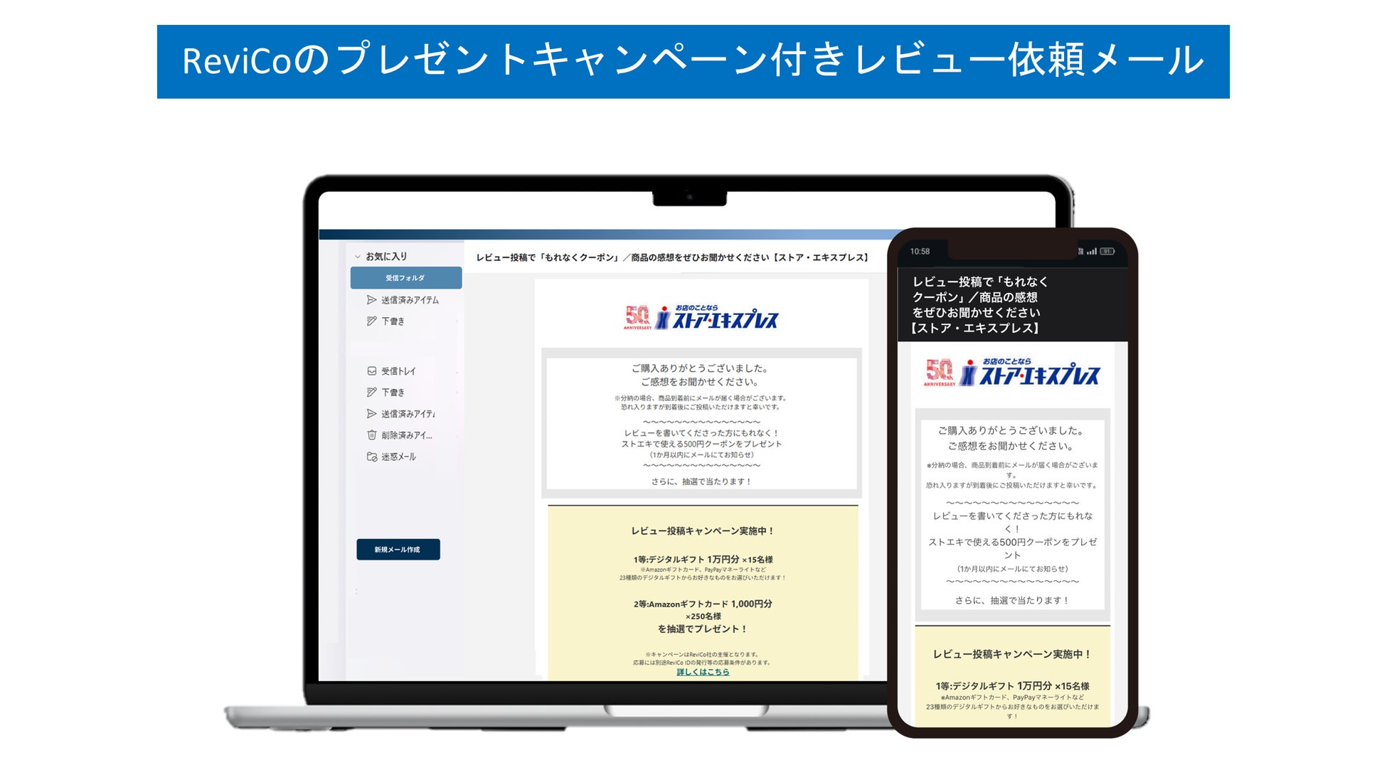 ReviCoが費用・抽選・発送を全て負担し実施するプレゼントキャンペーン付きレビュー依頼メールの配信や、最短1ステップで投稿が完了する簡易な投稿フローにより、継続的にレビューを獲得できます。