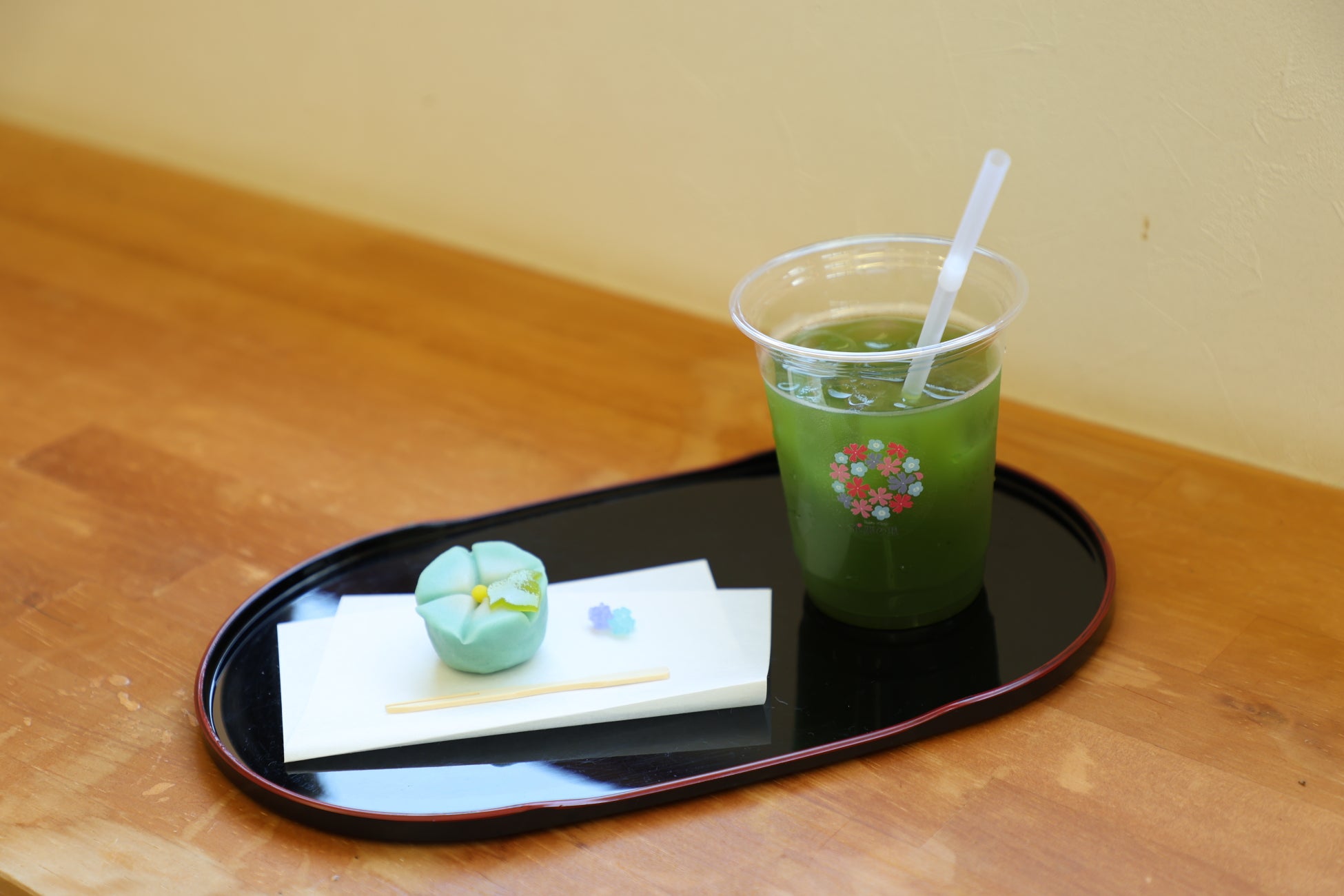 地元世羅で人気の和菓子店「大手門」さんに特別に作っていただいた「ヘブンリーブルー」をイメージした和菓子と、冷たいグリーンティーをセットでご提供します。