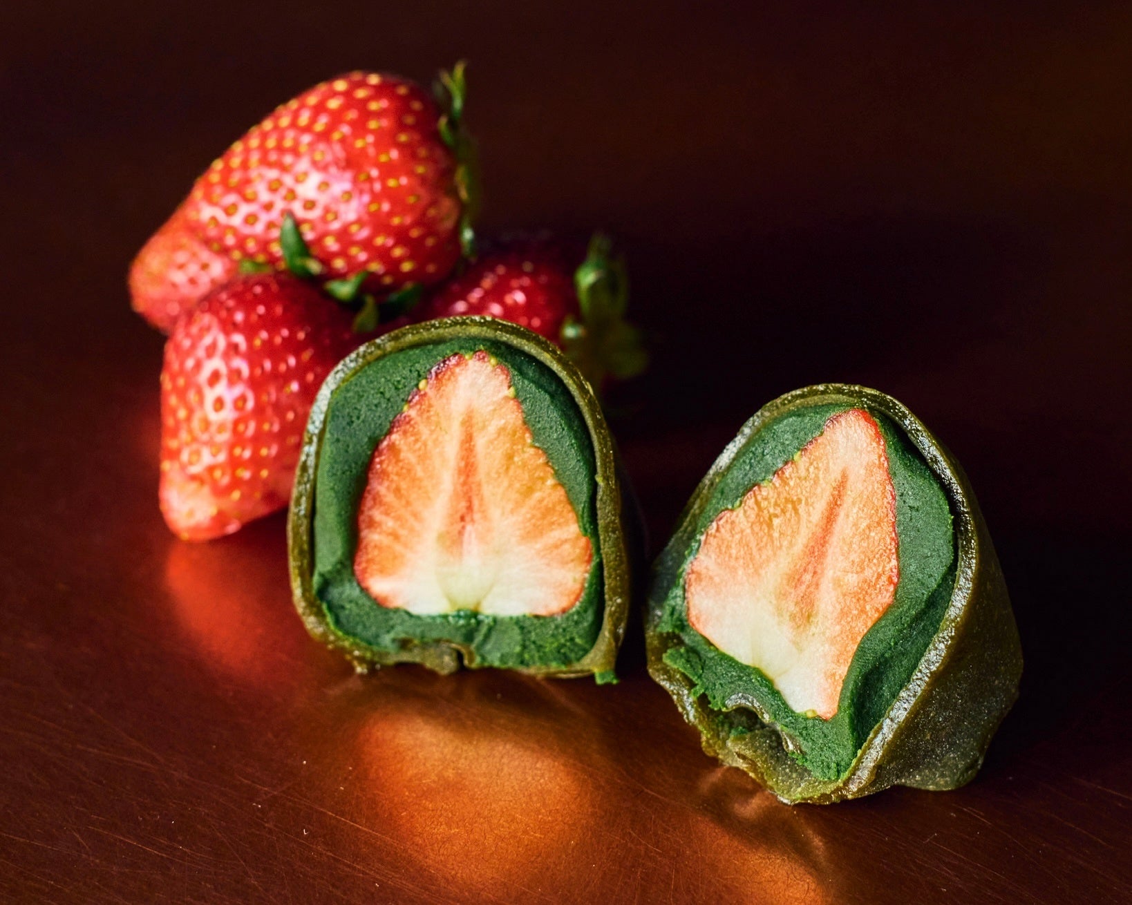 こだわりの抹茶をふんだんに練り込んだ抹茶求肥で、濃厚な抹茶餡と苺を包んだ「八十八苺大福」。
