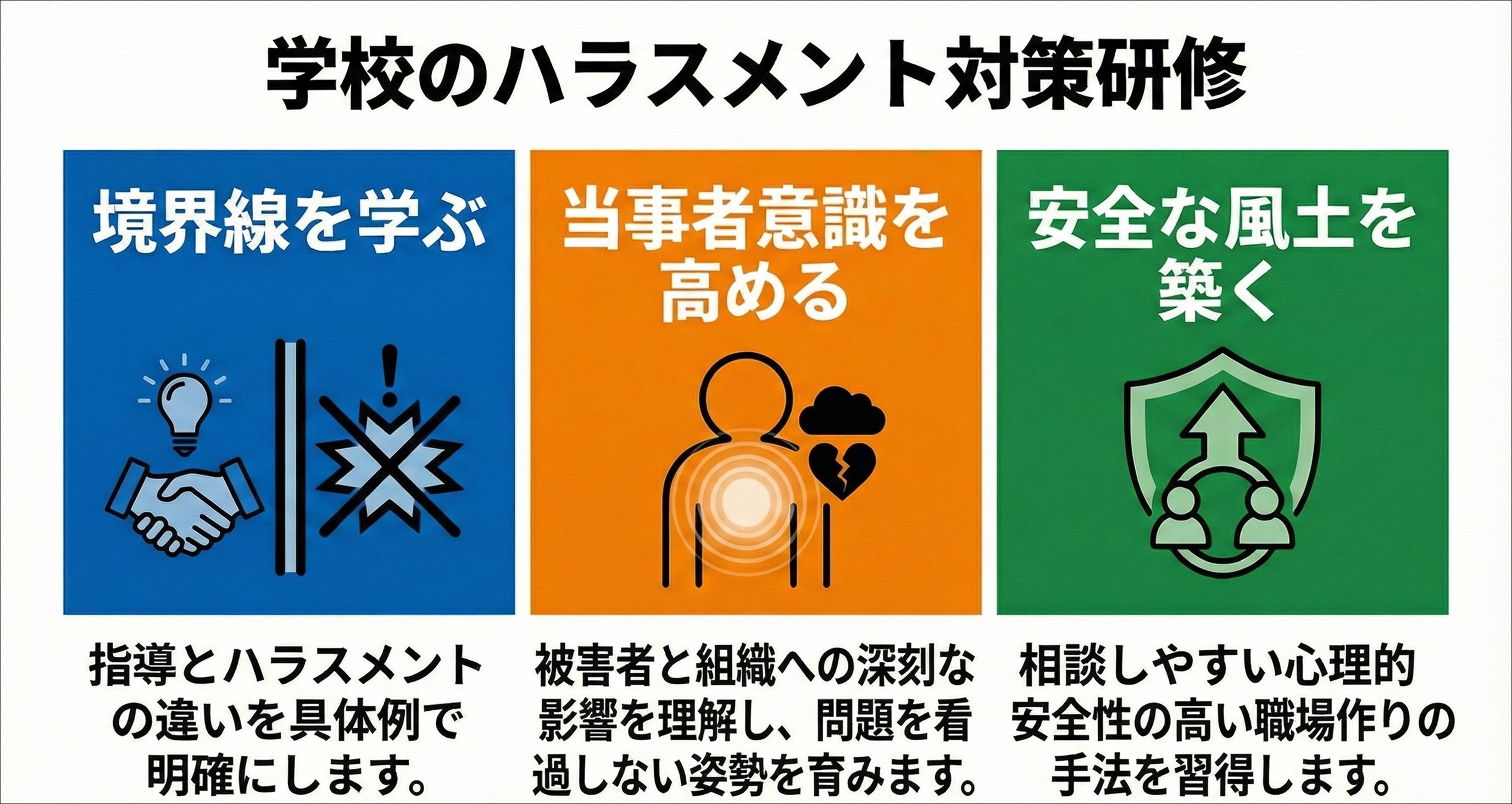 学校向けハラスメント防止研修は、学校現場特有の事案を定義し、組織と個人の両面から予防と対応を習得することを狙いとしています。