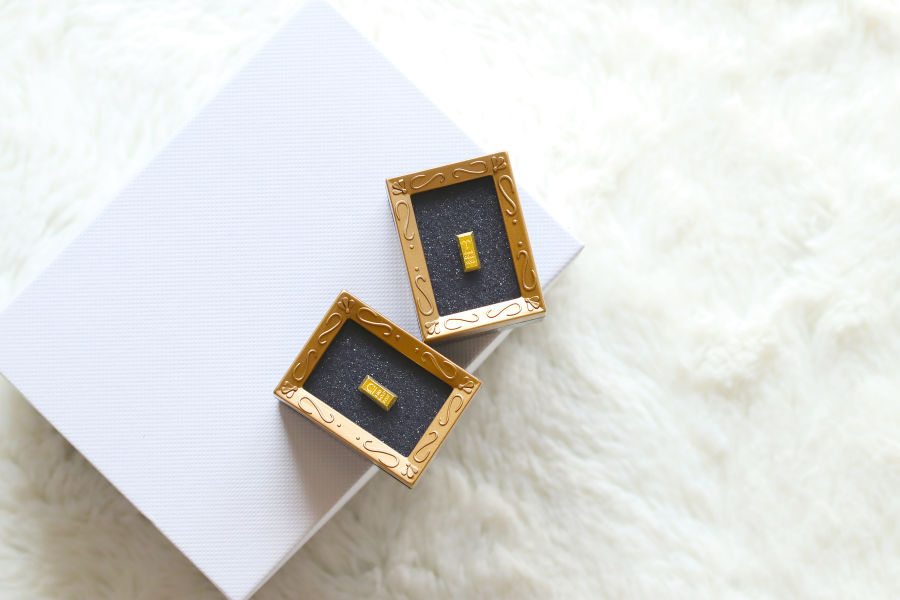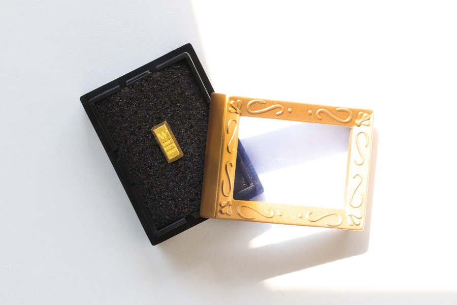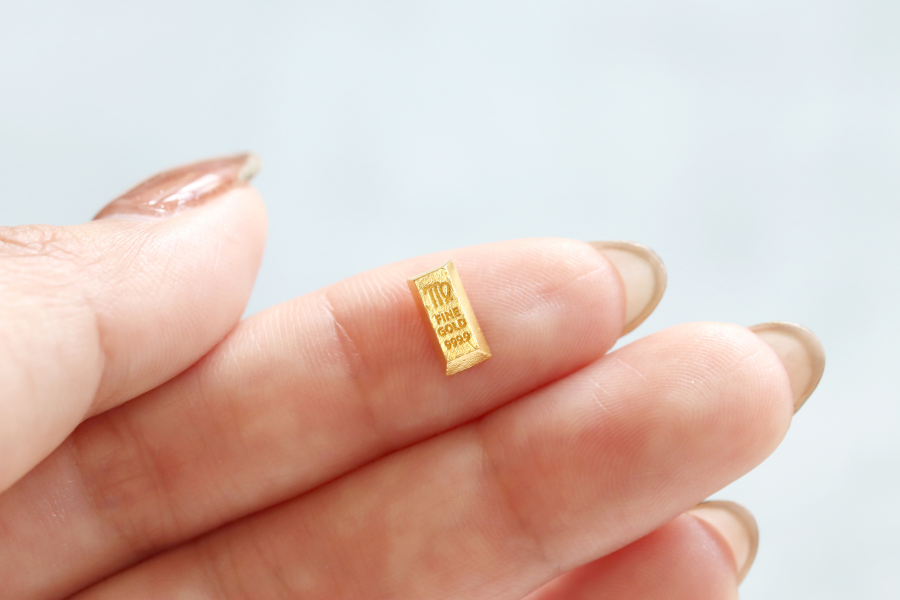 1gだけどしっかり刻印の入ったホンモノのインゴット型。FINE GOLDの名称は世界共通です。
