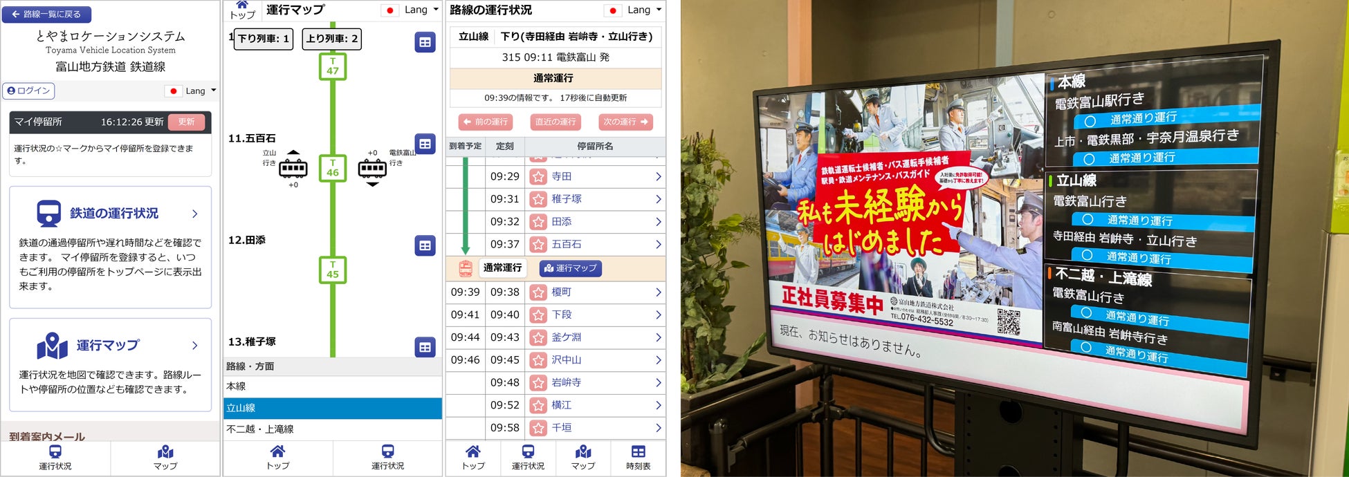 今回、富山地方鉄道の鉄道線にも対応することで、富山県内のバスと電車のリアルタイムな情報を、「とやまロケーションシステム」のWebサイト1つで確認できるようになります。また、鉄道線の電鉄富山駅・上市駅・南富山駅・電鉄黒部駅に設置したデジタルサイネージでは、「とやまロケーションシステム」を活用した列車運行情報や列車接近情報をリアルタイムで提供します。
