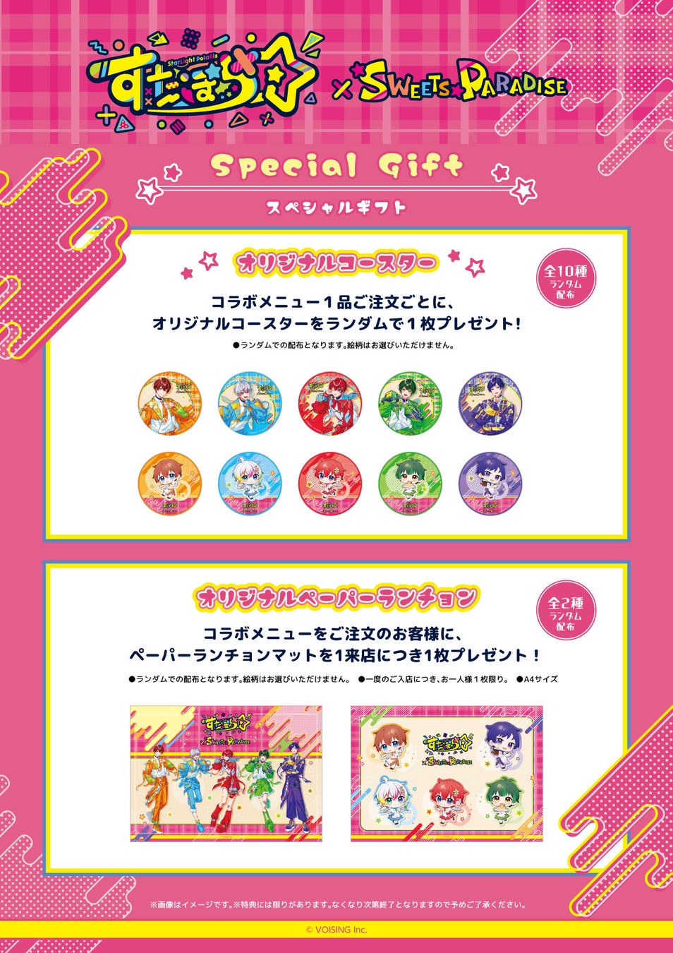コラボメニューをご注文いただいたお客様全員に、1来店につきランダムでペーパーランチョンマットをプレゼント。ランチョンマットには、新ビジュアルになった「すたぽら」メンバーが描かれたデザインと、可愛らしいデフォルメイラストが描かれたデザインの2種類があり、食事の時間を特別なものにしてくれること間違いなし。