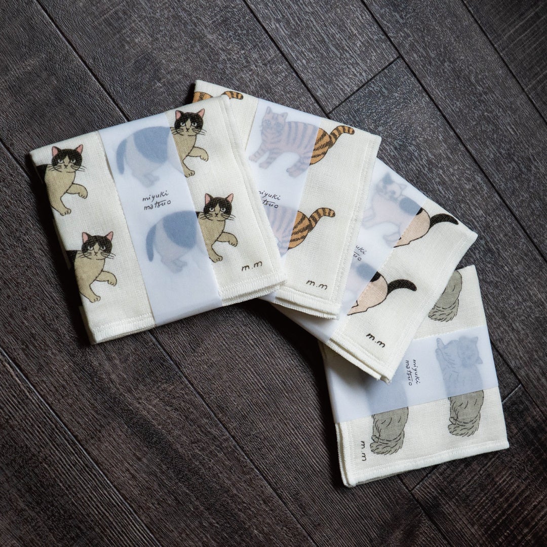 表面は柔らかな肌さわりのコットン、中と裏面は吸水性が高く汚れが落ちやすいレーヨンを7枚重ねた機能性も◎な、かやふきんです。松尾さん描き下ろしの4デザインをセレクト。