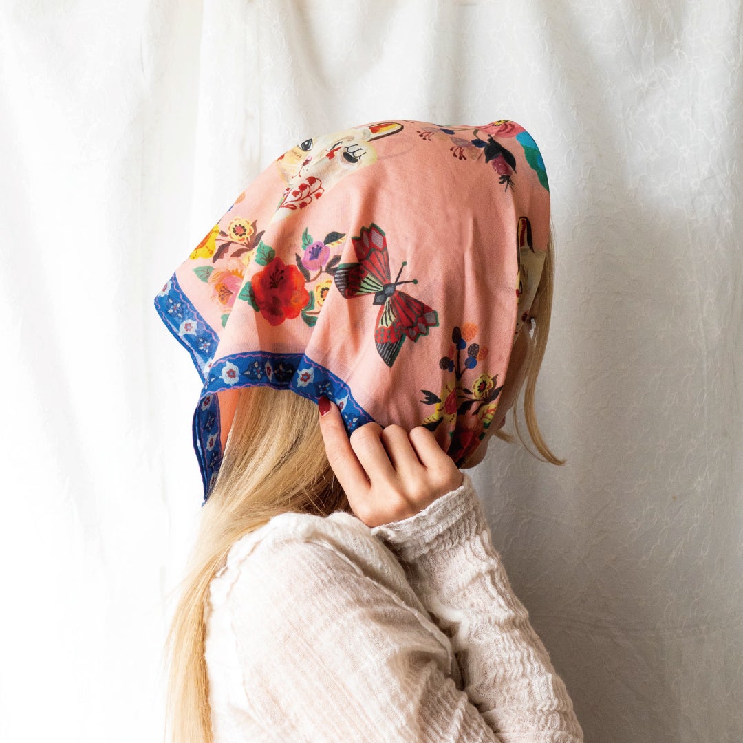 頭に巻いたり、バッグに結んだり、ちょっとしたギフトのラッピングにもおすすめ。広げれば小さなテーブルクロスやウォールアートのようにも使えそう。