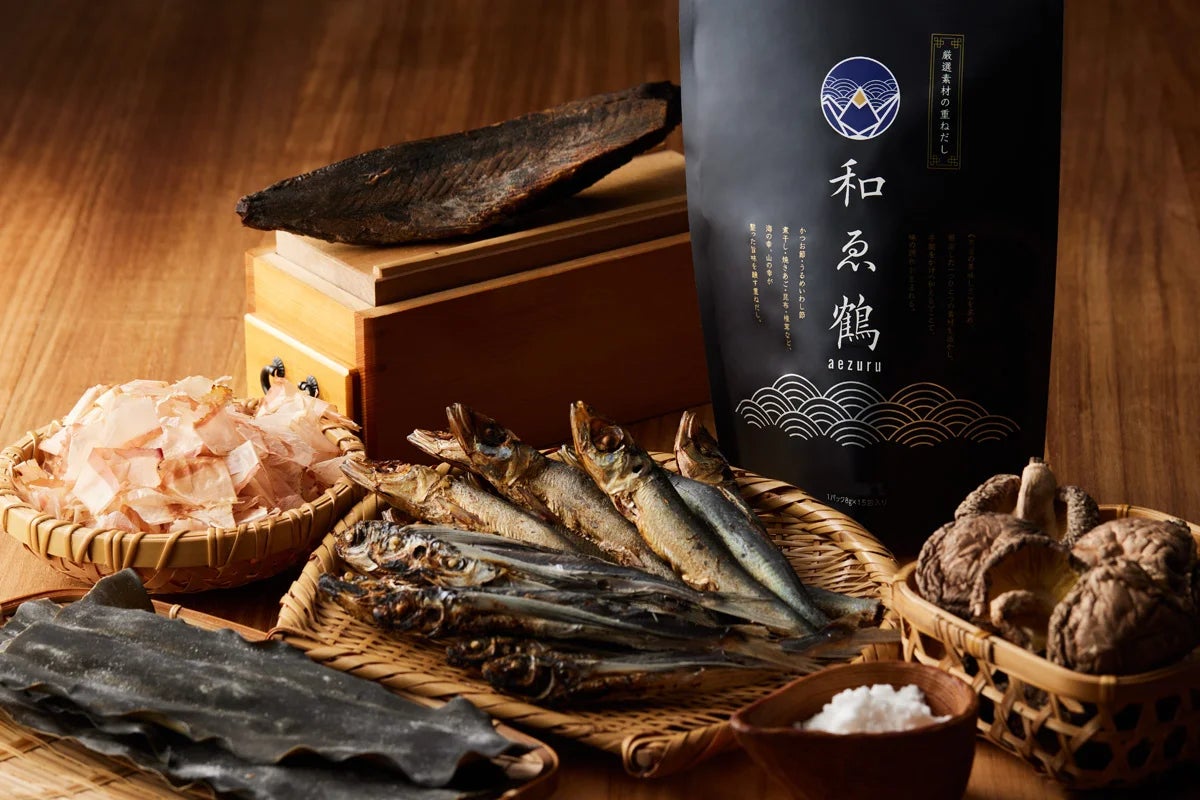鹿児島県枕崎産のかつお節を中心に、焼きあご、真昆布、うるめいわし節など、北海道から沖縄まで日本全国から集めた厳選素材たち。これらを“和える”ことで、旨味の相乗効果を最大限に引き出しながら、幾重もの試作を経て“調和”のバランスがとれた「和ゑ鶴」が生まれました。厳選素材の中でもとくに注目してほしいのが、濃い煮汁や強い燻煙などこだわりの製法と丁寧な手作業によって作られた、国内最高峰のかつお節。和ゑ鶴から漂う唯一無二の芳醇な出汁の香りと旨味は、このかつお節をベースにした素材の調和が原点になっています。(公式サイトより引用:https://www.aezuru.com/)」