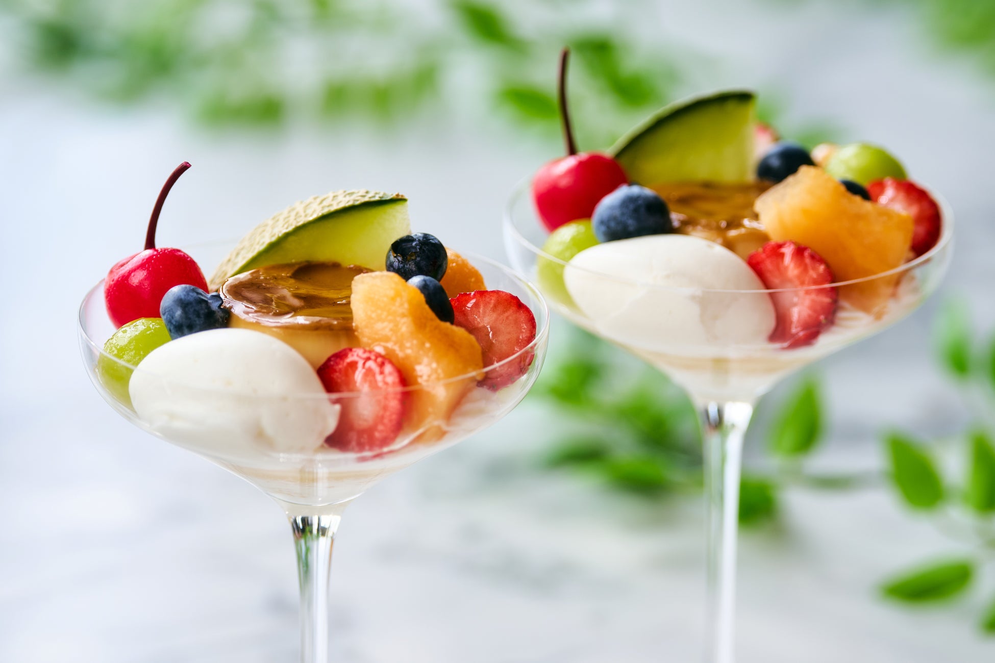 どこか懐かしいプリンアラモードにもメロンを添えて、フルーツを贅沢にあしらいました。