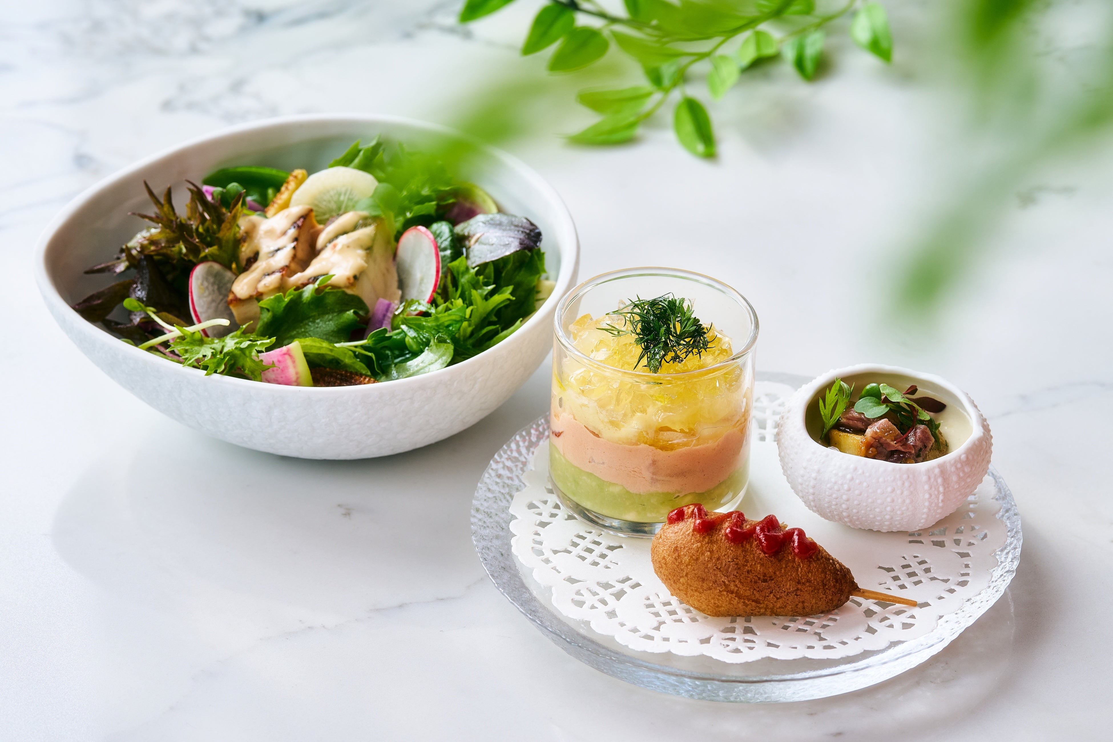 スペシャリティレストラン「Ocean Milano」のシェフが手掛けるセイボリーもお楽しみいただけます。春から初夏にかけて旬を迎える食材を使用し、一口サイズの枠に捉われず、一皿のお食事としてご満足いただけるラインナップを取り揃えました。ミニサイズのアメリカンドッグもホテルの自家製で、遊び心をくすぐる逸品です。また、ヴィシソワーズには新じゃがいもと新ごぼうを使用し、この時期ならではの味わいをご堪能いただけます。