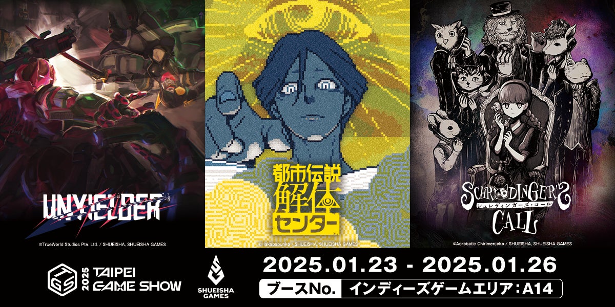 株式会社集英社ゲームズ(本社:東京都千代田区、以下 集英社ゲームズ)は、1月23日(木)から1月26日(日)の期間、台北で開催される「台北ゲームショウ2025」に出展することをお知らせいたします。「台北ゲームショウ2025」の集英社ゲームズブースでは、『UNYIELDER』『シュレディンガーズ・コール』『都市伝説解体センター』のプレイアブルを出展するほか、SIGONOと共同開発する『OPUS: Prism Peak』の体験型撮影スポットの展示と、「台北ゲームショウ2025」オリジナルの謎解きを実施する予定です。また、あわせて、『UNYIELDER』のプレイアブルでスコアを25万点以上獲得した方に『UNYIELDER』のオフィシャルマウスパッドのプレゼントや、各タイトルのスタンプを集めてオリジナルトートバックがもらえる会場限定スタンプラリーイベントも実施予定となっています。