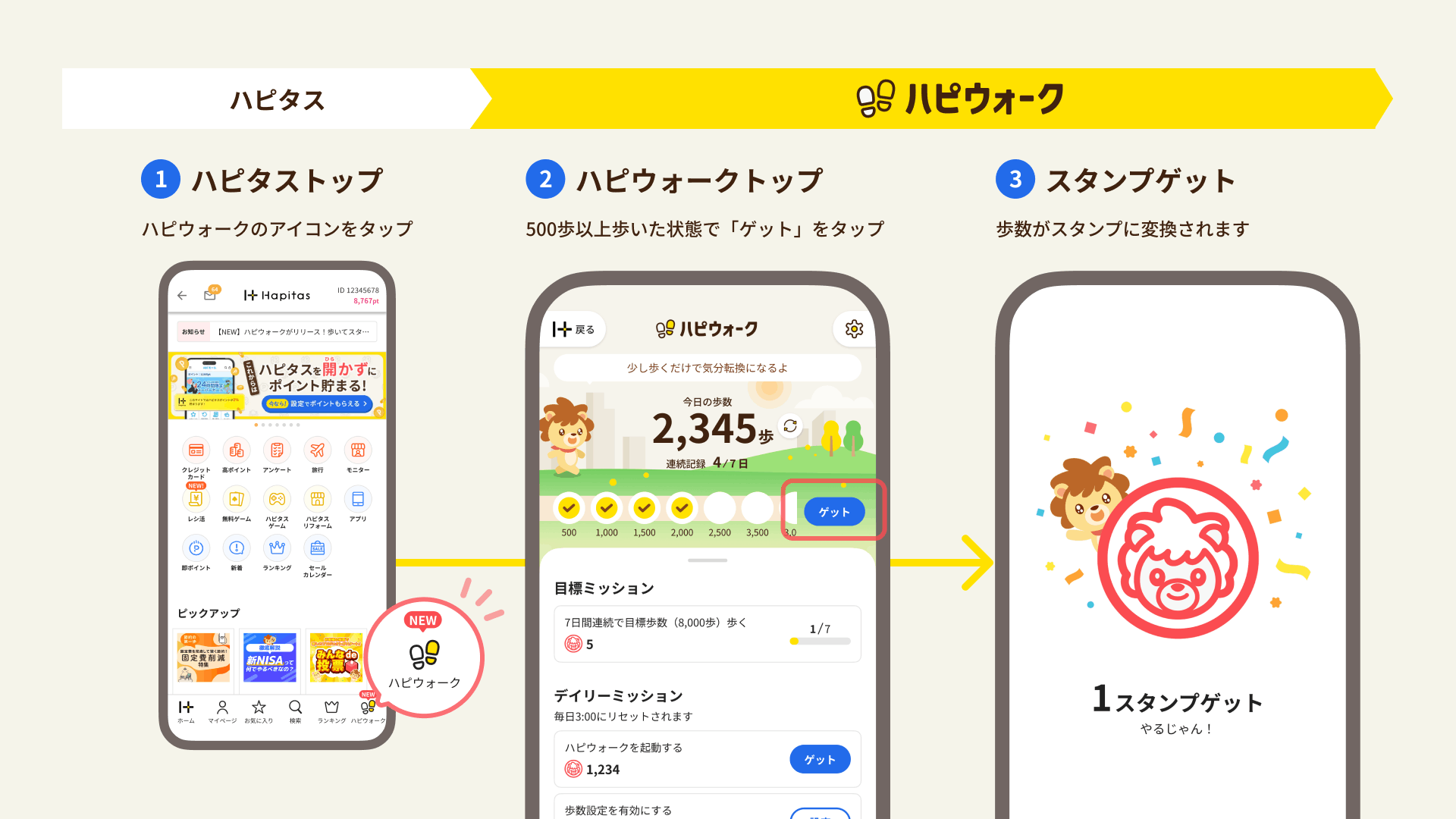 新機能「ハピウォーク」は、スマートフォンに記録された歩数データと自動連携し、アプリ画面のワンタップのみで歩数をポイントに変換できるサービスです。
