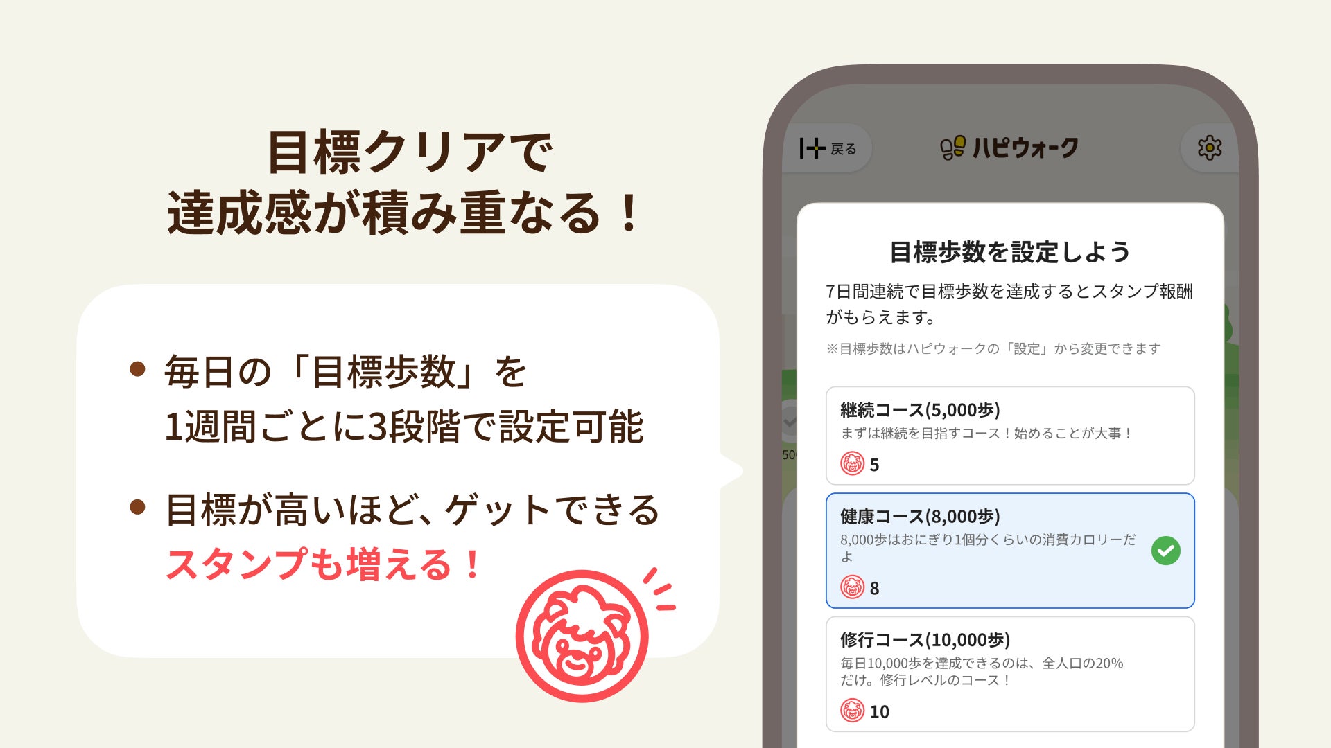 毎日同じ目標を目指すのではなく、ご自身の状況に合わせて歩ける柔軟性にこだわりました。目標歩数は3段階(5,000歩/8,000歩/10,000歩)から週単位で選択でき、自分にあった生活リズムで無理のない達成感を積み重ねられます。