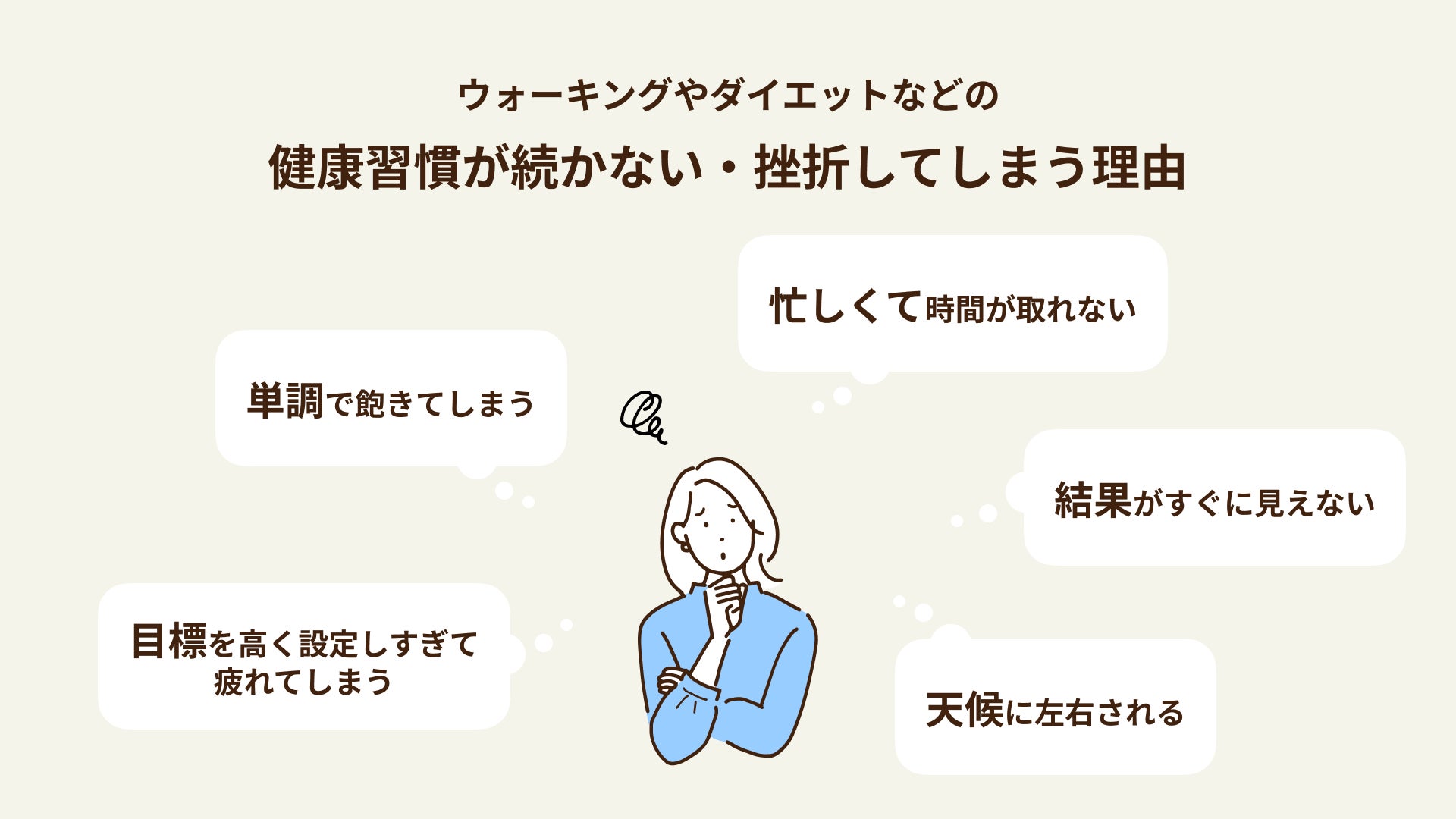 「健康のために」と分かっていても、忙しい毎日の中で継続することは決して容易ではありません。私たち自身も何度も挫折を経験してきたからこそ、多くの方が抱える「続かない」という悩みに共感をしています。