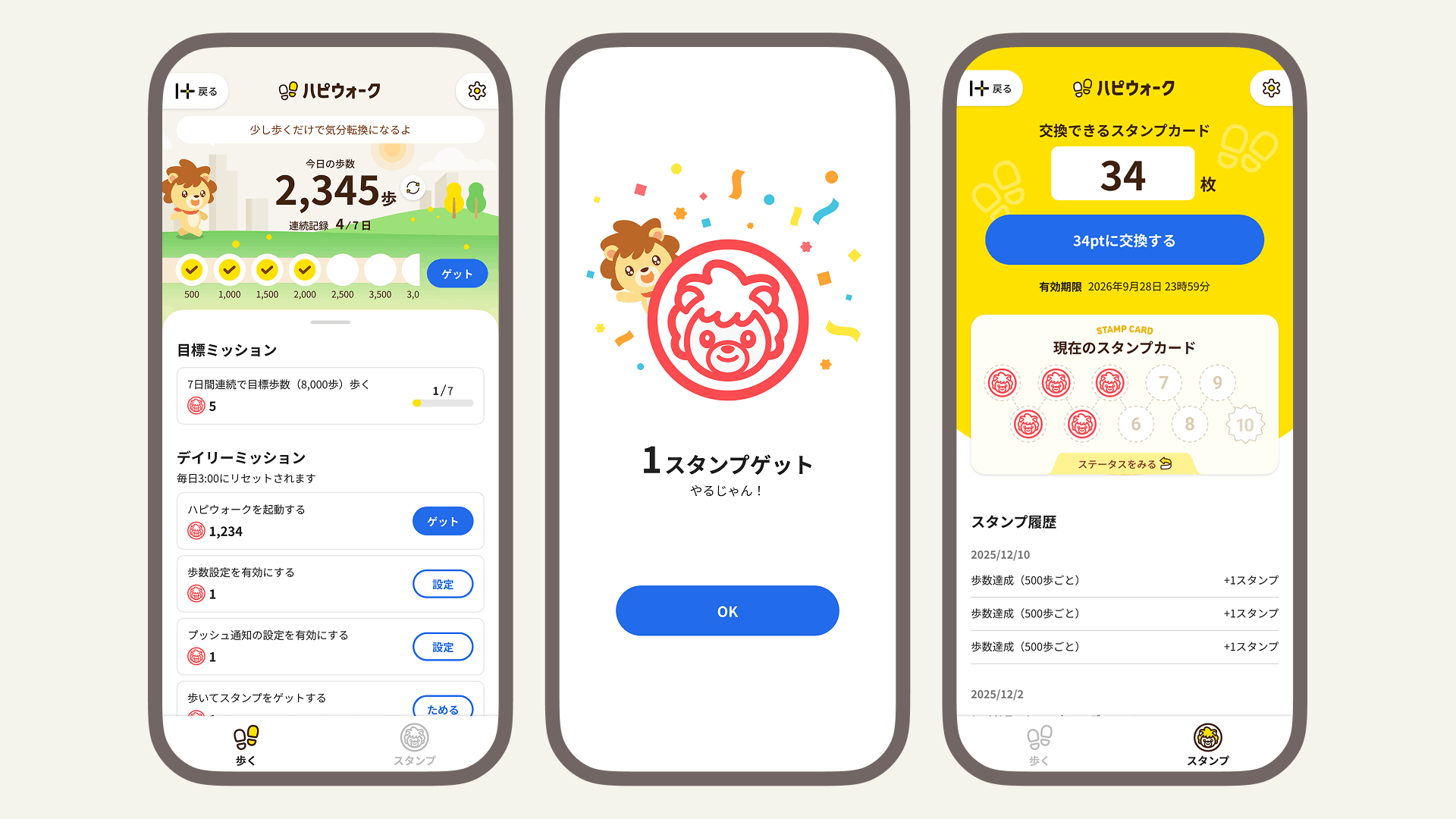 さらに、アプリ内では公式キャラクターの「はぴおん」がユーザーの歩数に合わせて一緒に画面上を歩き、応援コメントを表示する機能を搭載。