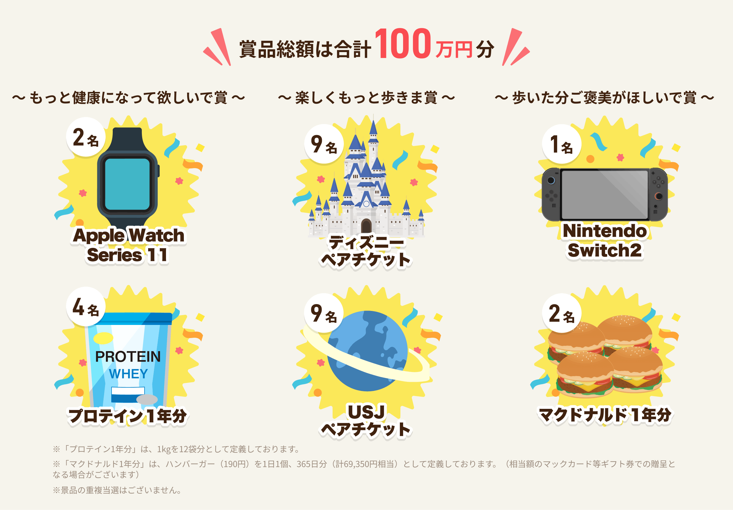 「ハピウォーク」の登場を記念し、ユーザー全員で合計100kgの脂肪燃焼を目指す特別なキャンペーンを開催します。日々の歩みをワクワクするイベントとして体感していただくための、豪華景品が当たる参加型企画です。