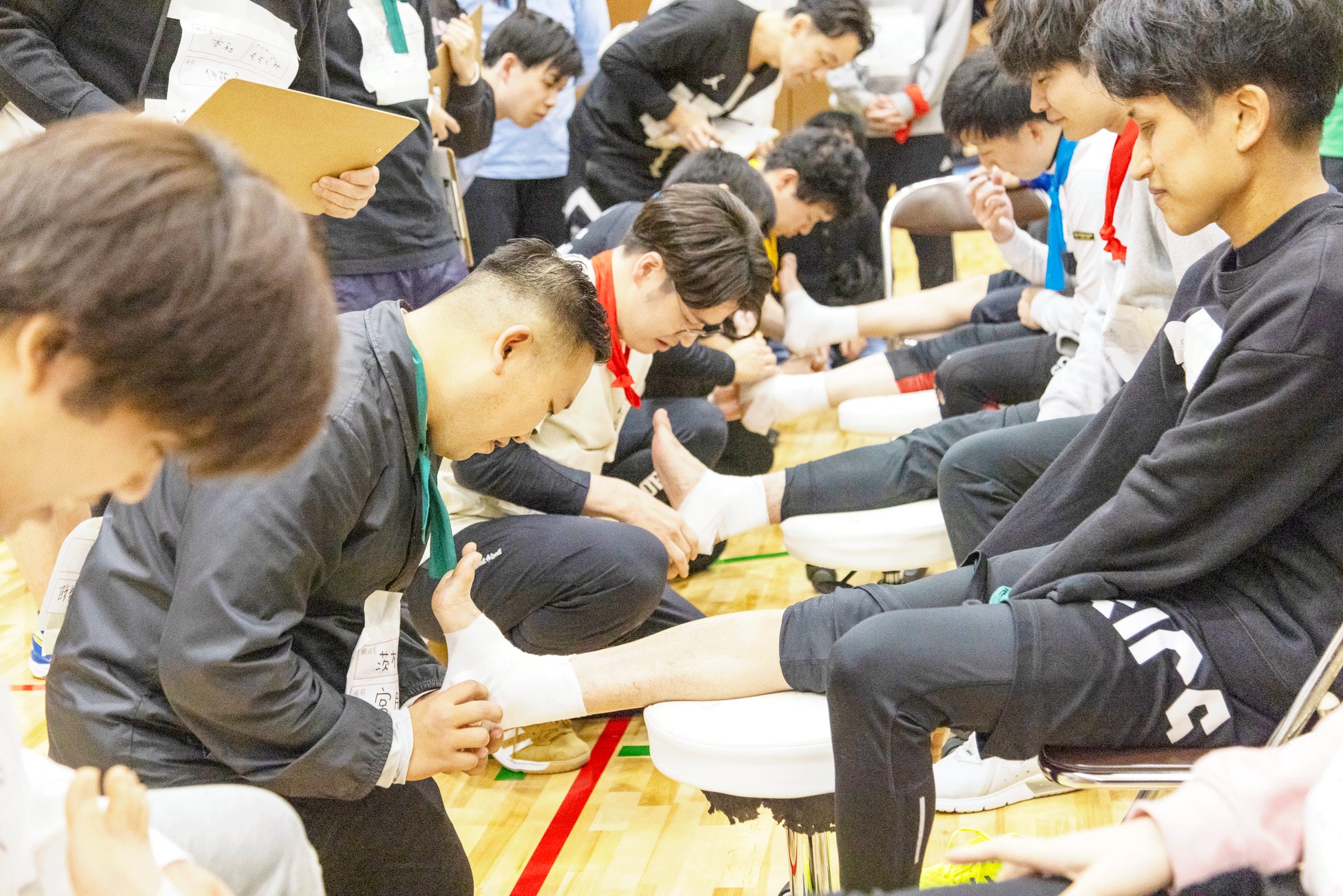 当日は、「チーム対抗リレー」や「玉入れ」などの人気プログラムに加え、専門内容を取り入れた競技「あい・グランプリ」を導入しました。包帯を巻く速度を競う競技や、片手挿管の速度を競う競技、またタイピングの速度を競う競技を行うなど、多彩な種目を実施し、参加者全員が一丸となって競技に挑み、 今年も、大人が本気を見ることができました。