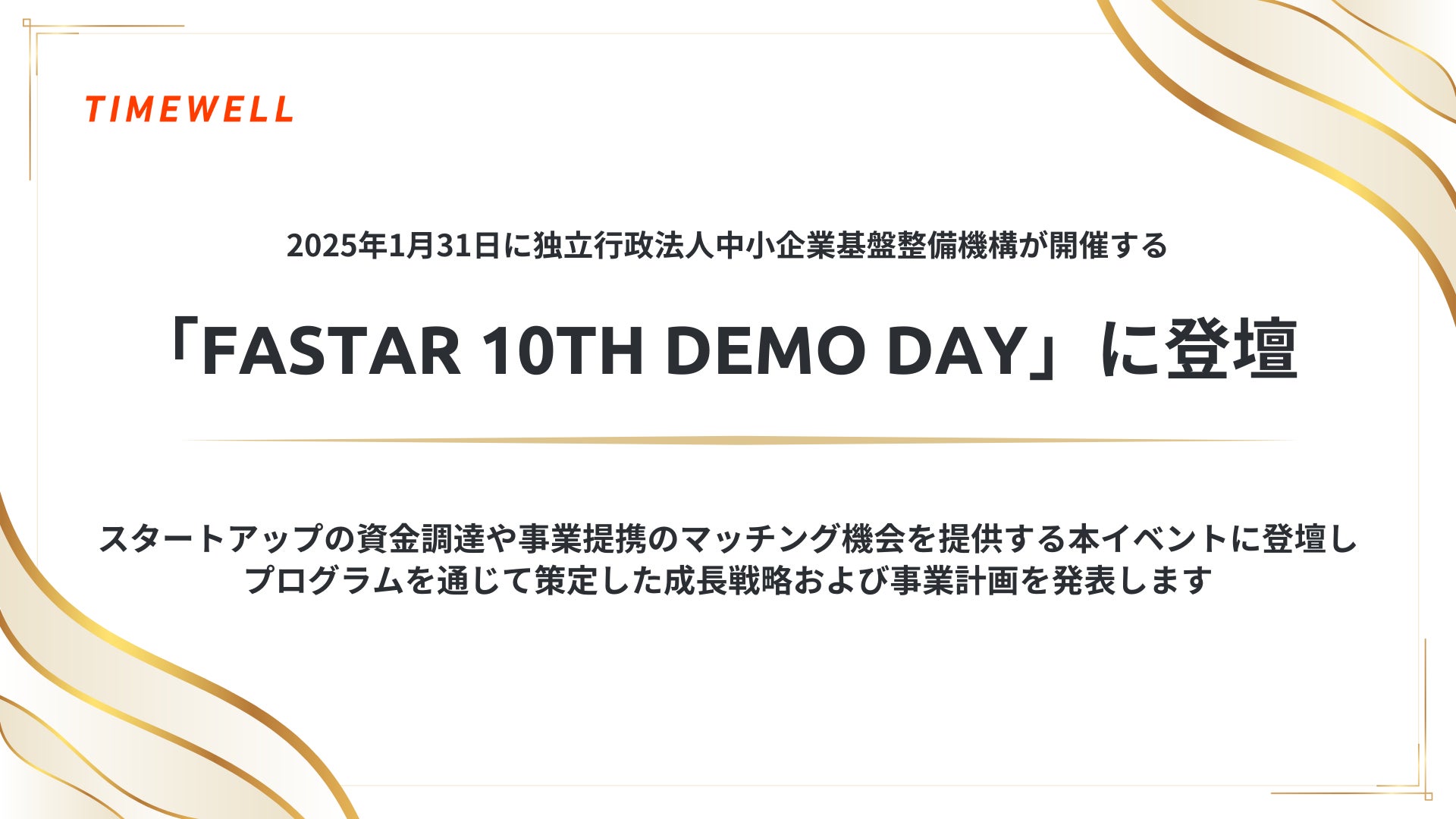 株式会社TIMEWELL(本社:神奈川県横浜市、代表取締役:濱本隆太、以下TIMEWELL)は、2025年1月31日(金)に開催される独立行政法人中小企業基盤整備機構(理事長:宮川正 本部:東京都港区)主催のアクセラレーション事業「FASTAR 10th Demo Day」に登壇することをお知らせします。