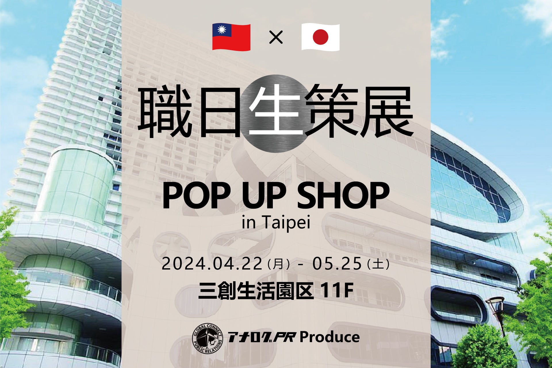 この度、弊社サービスの「グローバルコネクトPR」の一環として、ポップアップショップを実施する運びとなりました。「日本・職人・生活」をテーマに、食品や雑貨、生活用品など、クライアントである日本メーカー及び日本で活躍する職人達のこだわり抜いた商品を展示販売いたします。このイベントの実施により、日本企業の海外進出の成功のきっかけになることはもちろん、台湾の多くの方々に日本の技術や品質の高さを手に取り、感じていただけると思います。