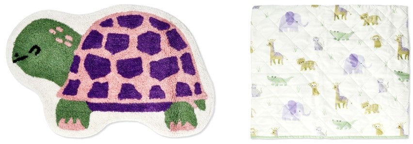 にこにこカメさんのラグでお部屋が華やかに!たくさん絵が描かれたブランケットの裏側は、なんとグリーンのゼブラ柄