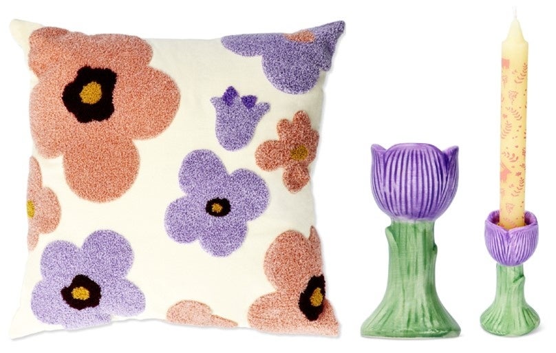 ふわふわフラワーがたくさんついた大きめクッションと、パープルのキャンドルホルダーでお部屋を華やかに。