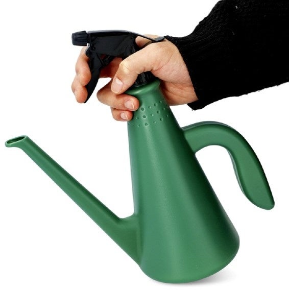 じょうろで土に水をあたえ、ミストで葉っぱに潤いをあたえる。二刀流の使い方ができます。ん~画期的!
