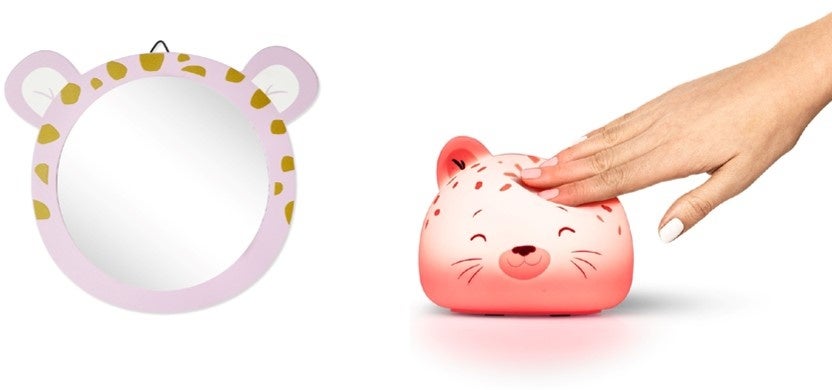 ピンクのヒョウがモチーフになったミラーは壁掛けに!押すと色んな色に光るやわらかランプはキッズに大人気!